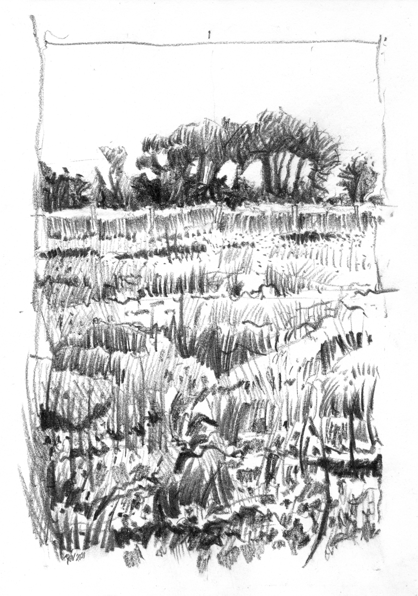 Siberisch krijt / houskool op 160 gr tekenpapier 21 x 15 cm . De tekening wordt zonder afsnijding in een passe-partout ingelijst.