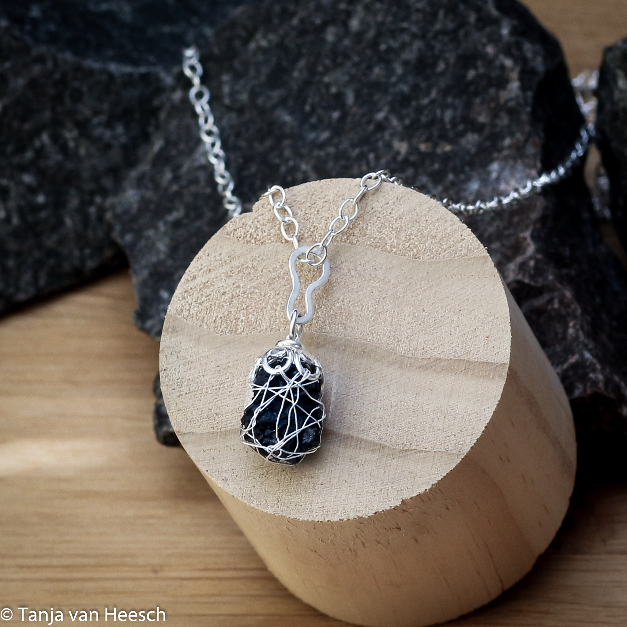 Hanger van zilver, met een donkerblauw azurietroosje dat is ingepakt met dun zilverdraad. (Prijs is voor de hanger, zonder ketting)