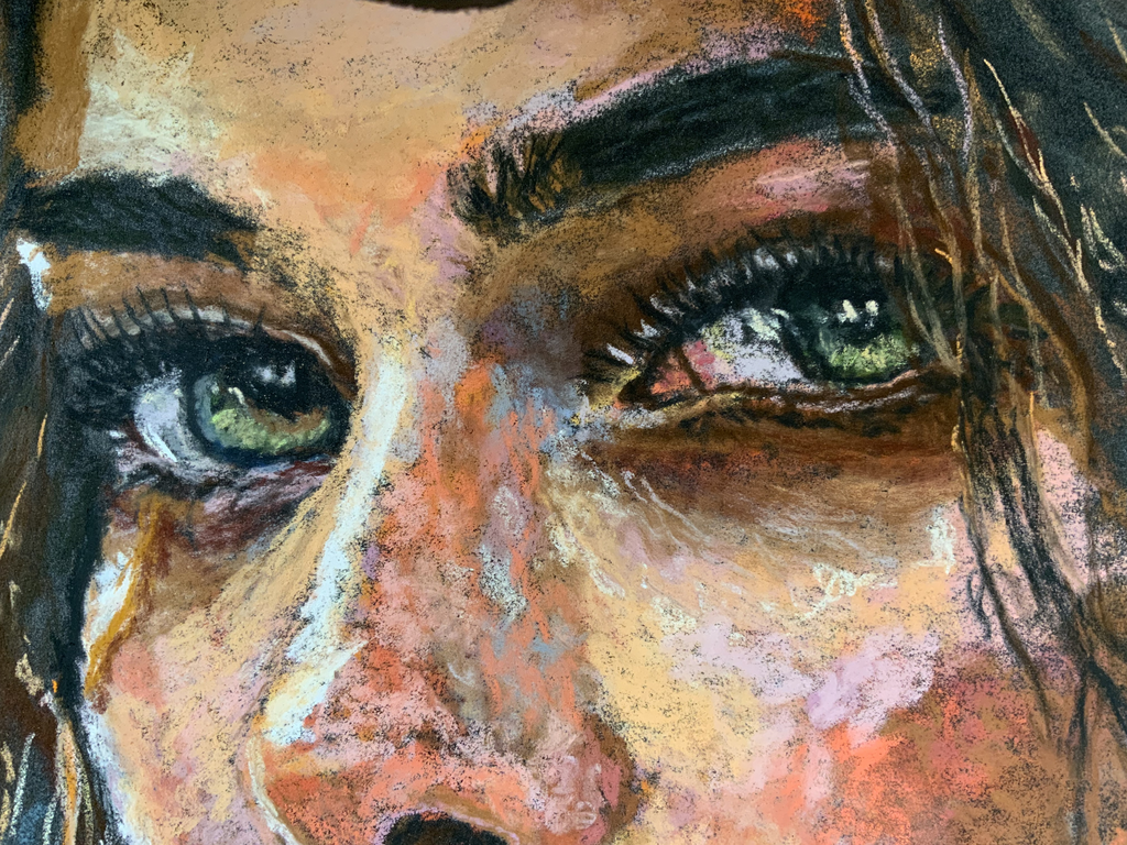 Expressief portret van een blonde vrouw met een krachtige en intense blik, uitgevoerd in soft pastel.