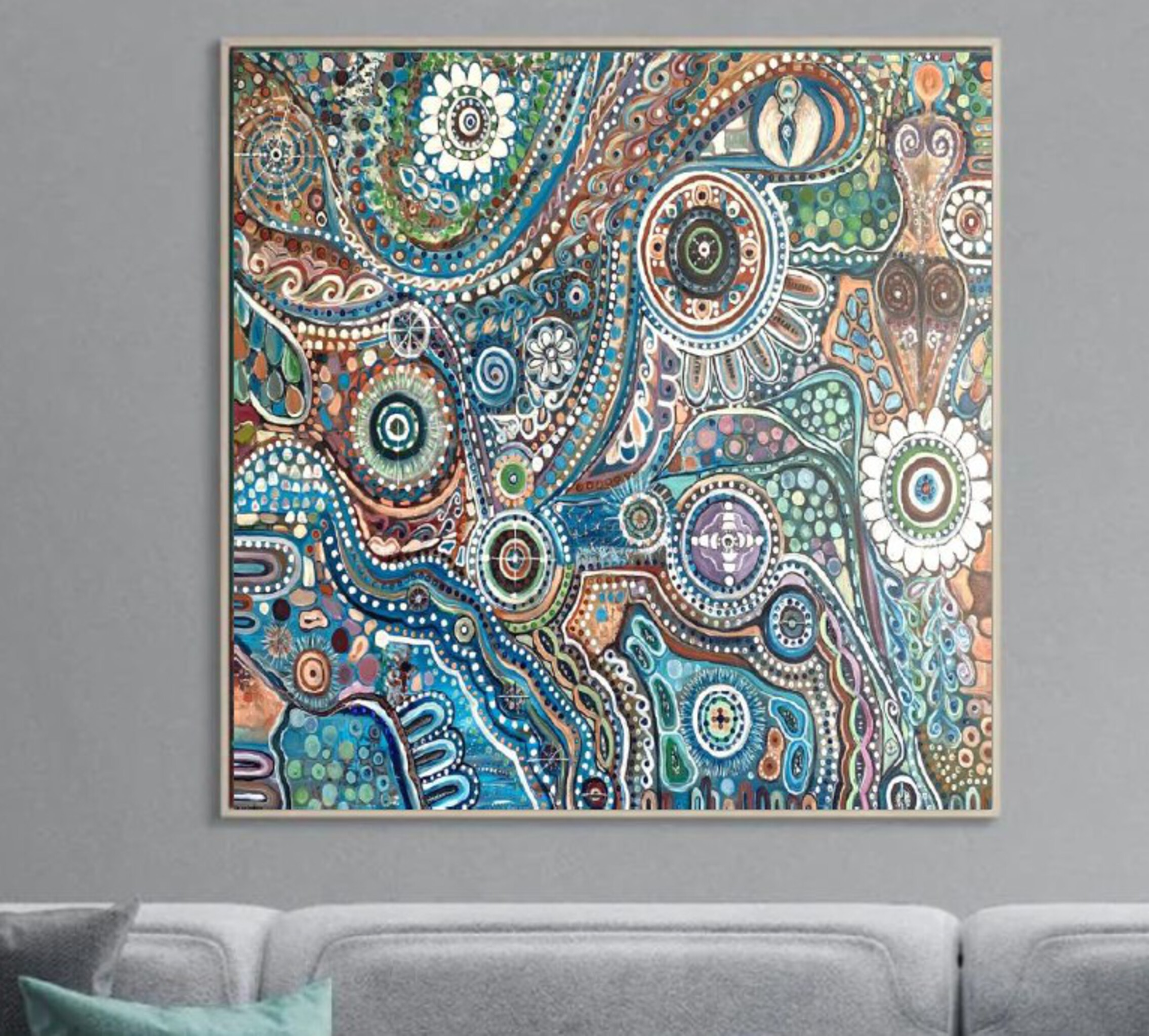 The River of Remembering This painting feels like a tapestry of memories, dreams, and nature woven together. The swirling patterns resemble flowing water, carrying fragments of life—flowers, seeds, spirals, and stars—all drifting in one great current. The white dotted paths are like ancient songlines, marking the invisible threads that connect people to the land, to each other, and to the universe. It tells a story of interconnectedness: every being, every thought, every memory becomes part of this river. The blues and greens whisper of water and growth, while earthy tones root it in the soil of lived experience. In essence, The River of Remembering is a visual map of how life carries us forward, but also how everything we are—our past, our ancestors, our environment—flows alongside us in an eternal dance.