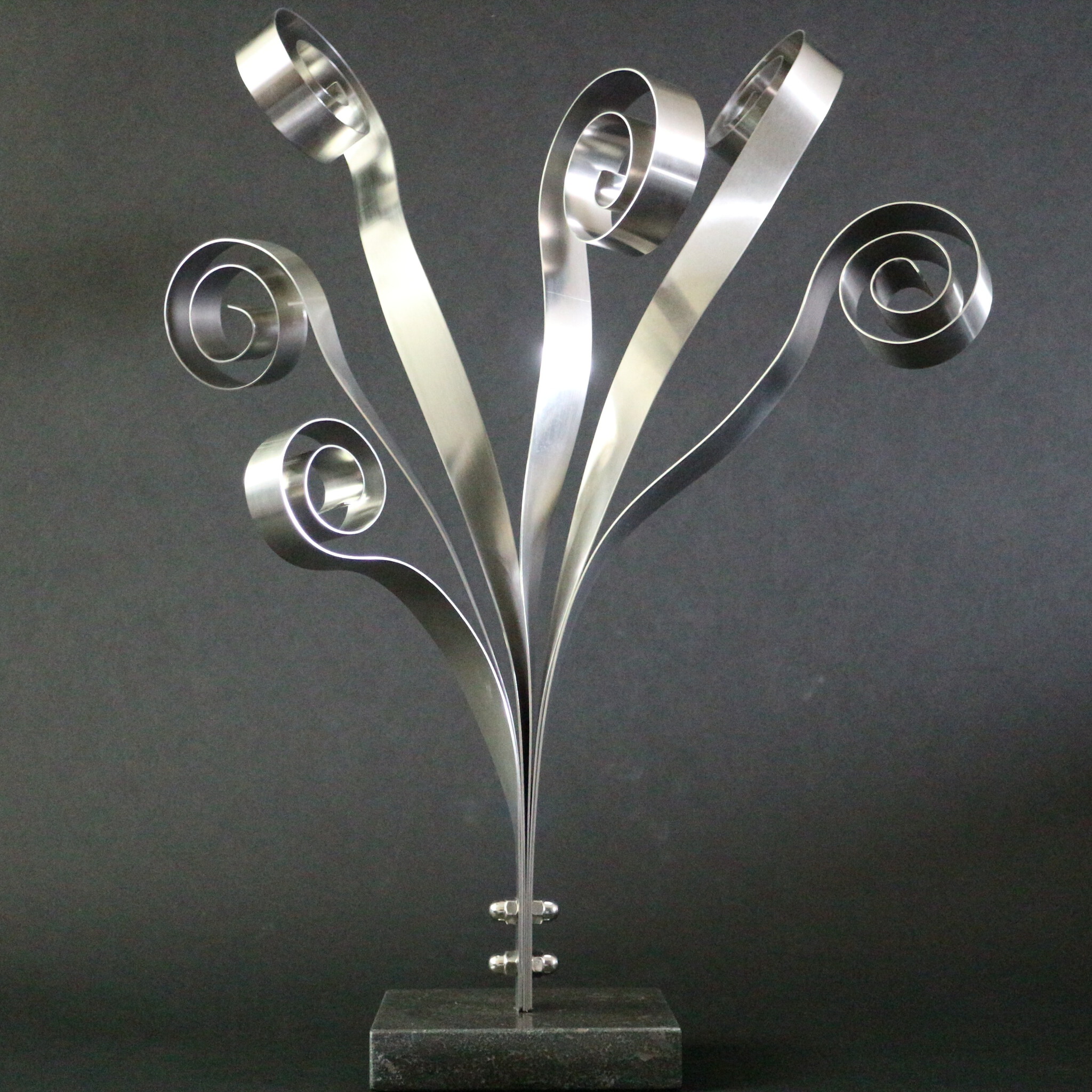 De krullen deden mij denken aan de veren van een pauw. Als een pauw zijn veren opricht dan is dat een spectaculair gezicht. Deze “veren” staan weliswaar slordig uitgespreid maar het geheel lijkt toch met wat fantasie op de staart van een pauw. Het sculptuur is gemaakt van 3 mm breed, 1mm dik RVS strip. Gemonteerd op een hardstenen sokkel.