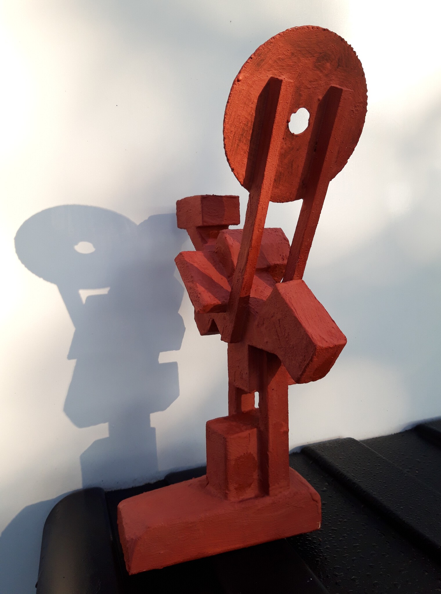 "Zoekend naar woorden / die een boodschap brengen / kijkt de lezer op het wiel / dat met de klok mee draait" (hout, objet trouvé, A1-gips, pigment)