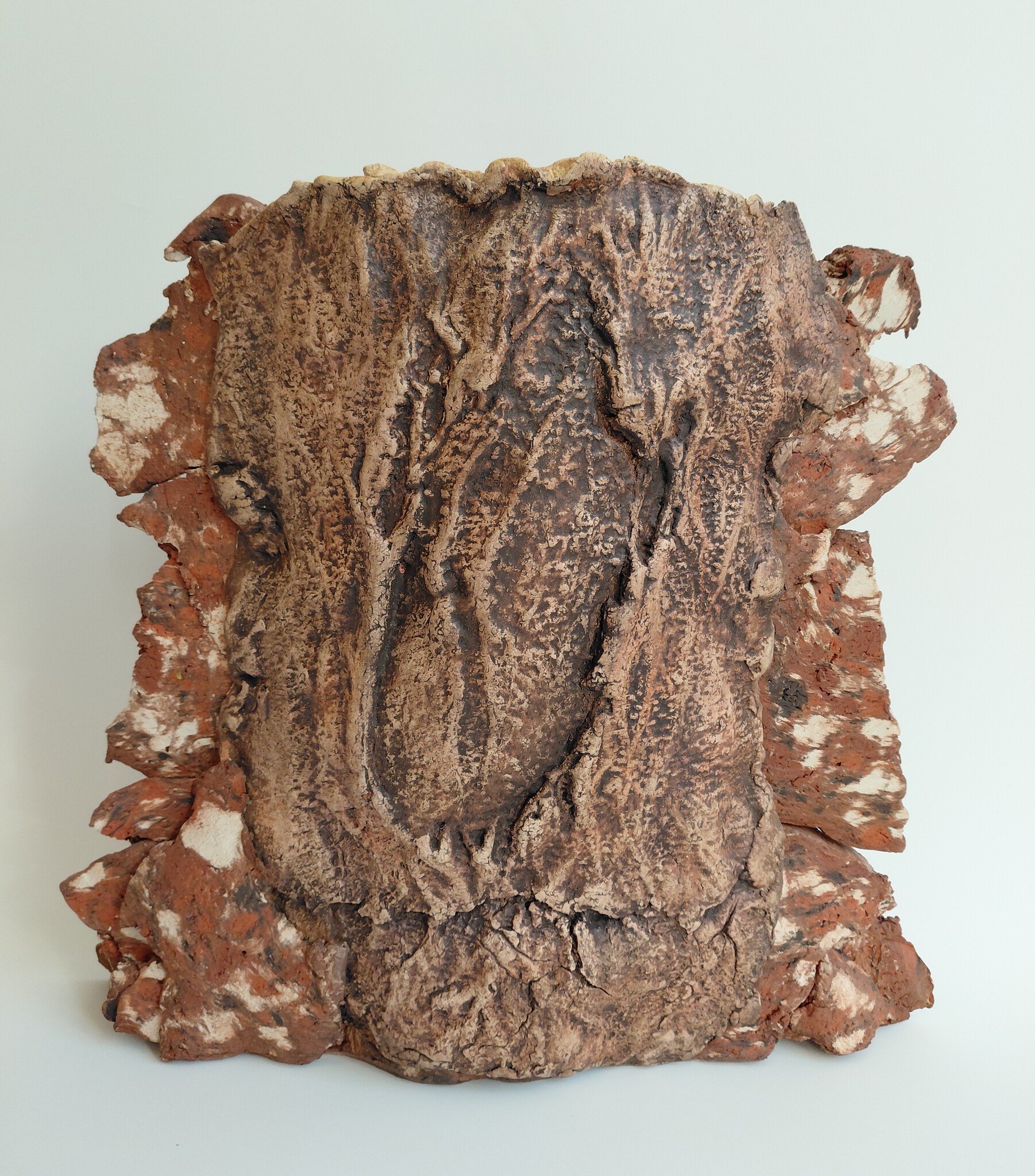 Dit object is opgebouwd uit plakken klei met schorsafdruk, bewerkt met engobe en glazuur