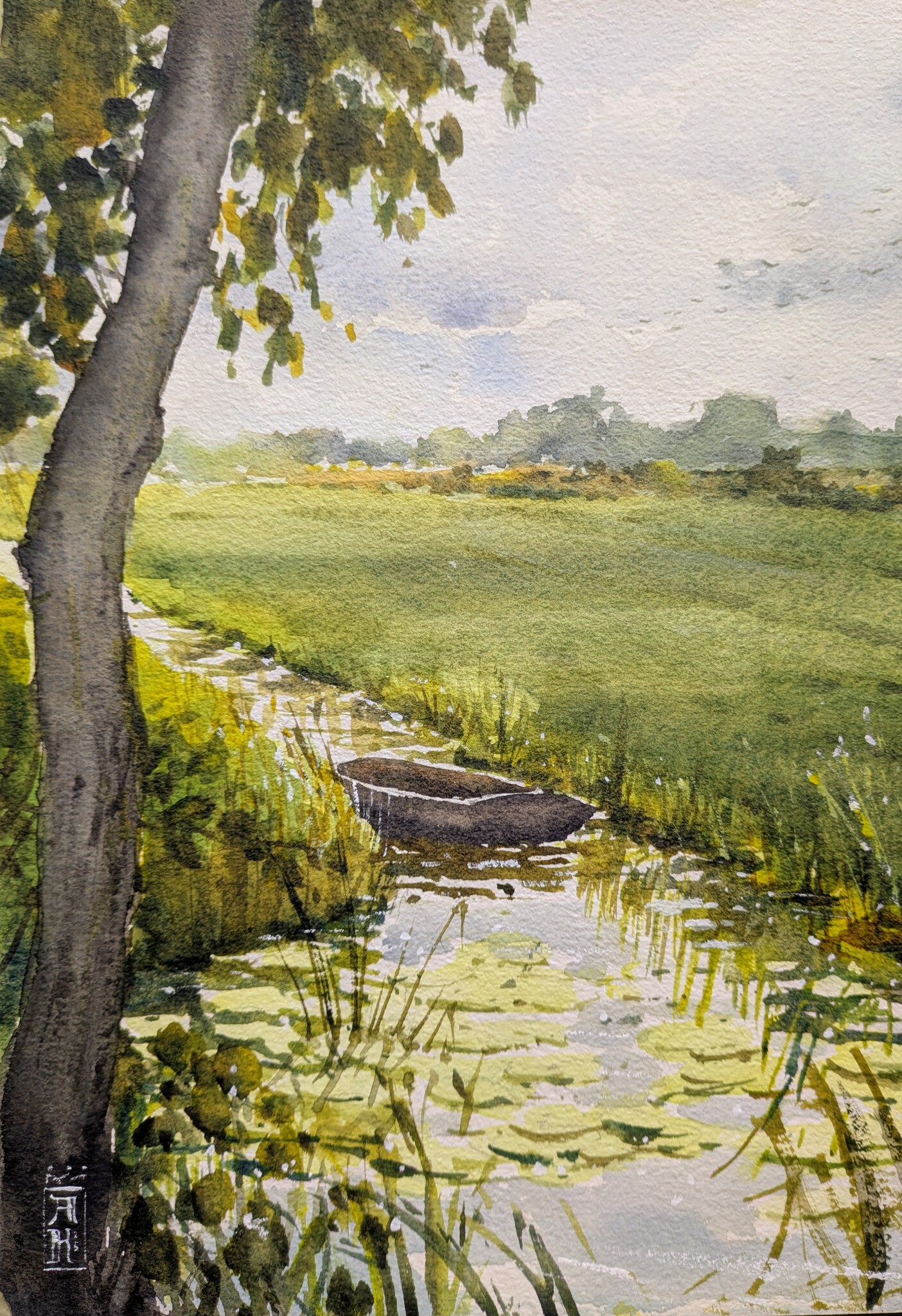 Schilderij Aquarel Realistisch Natuur Painting Polder Weiland Watercolor Bootje Roeiboot Countryside Boat Platteland "plein Air"
