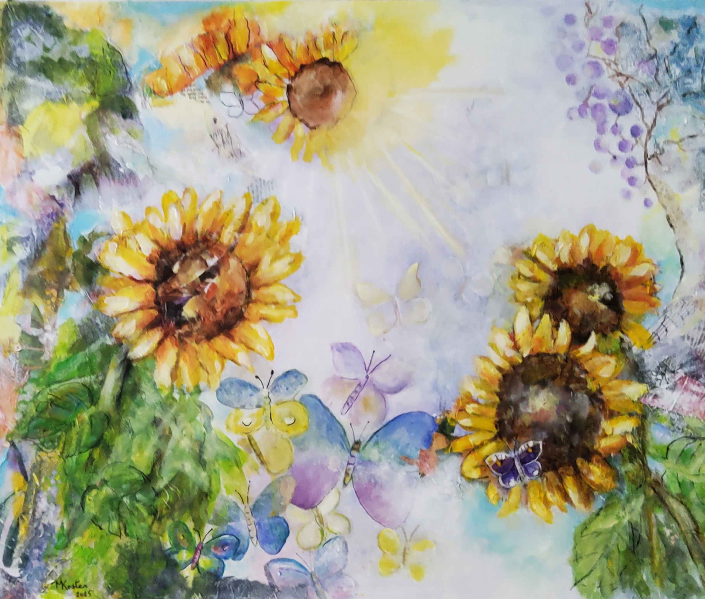 Gemaakt over een bestaand schilderij met vlinders. Gedeelten van dat schilderij spelen mee in het nieuwe werk. Gewerkt met papier, stof en acrylverf. Het proces van voortgang kun je vinden op Facebook bij: Schilderijen van Marian Koster.