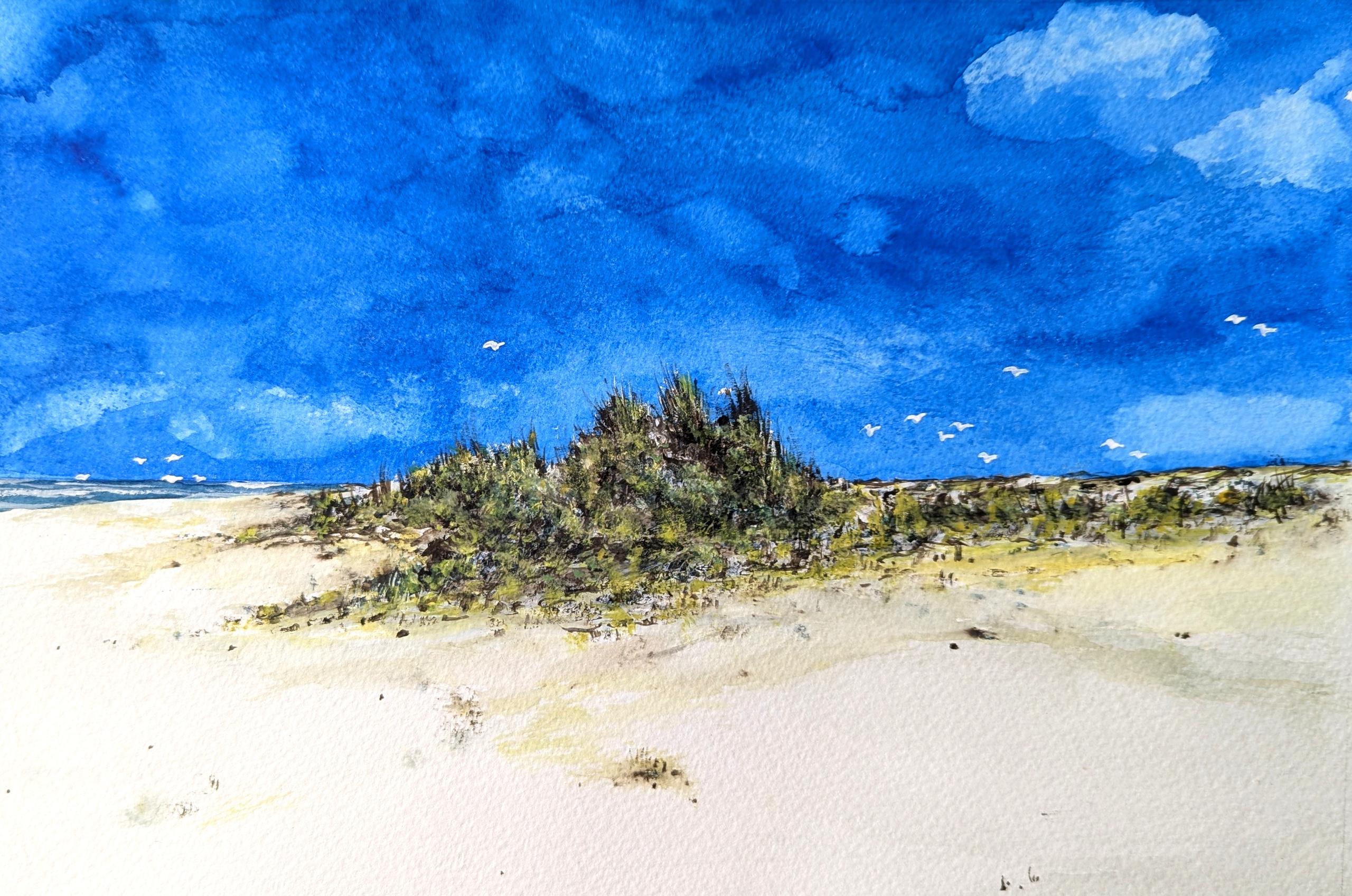 Voor het eerst naar Ameland in 2021. En in 2023 waren we er terug. We logeerden en fietsten er een aantal dagen rond. De weersomstandigheden waren fantastisch. En zeker op de fiets adem je dan dit droomeiland helemaal in. De witte stranden en duinen. De rust. Ik ben sowieso al gek op kusten, dus hier kom je helemaal aan je trekken. Thuisgekomen onmiddellijk het aquarelblok tevoorschijn gehaald. En mijn impressies vastgelegd. Een tweede vakantie op Ameland, maar dan thuis. Het Oerd is een omvangrijk natuurgebied aan de oostzijde van Ameland. Het is een oud en begroeid duinencomplex, waarvan de Oerdblinkert met zijn 24 meter het hoogste duin van het eiland is.