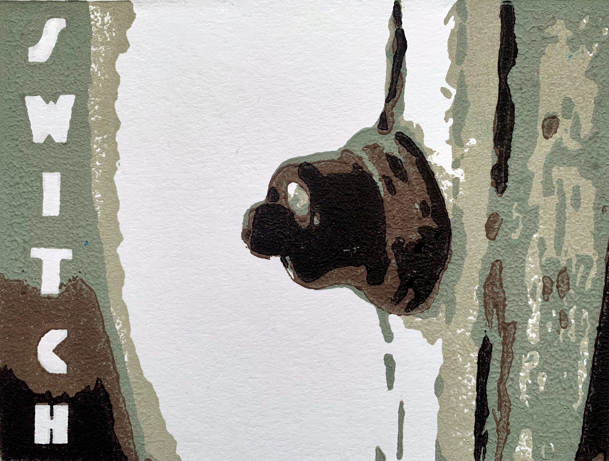 Deze linoprint is gebaseerd op een foto die ik in 2005 maakte in het voormalige woonhuis van Anne Frank aan het Merwedeplein in Amsterdam. De oude bakelieten schakelaar trof me als stil getuige van een leven dat abrupt werd afgebroken, maar ook als universeel symbool van verandering. Switch gaat over het moment waarop iets omslaat — verleden naar toekomst, donker naar licht, stilte naar beweging. Een klein voorwerp dat uitnodigt om niet te blijven stilstaan.