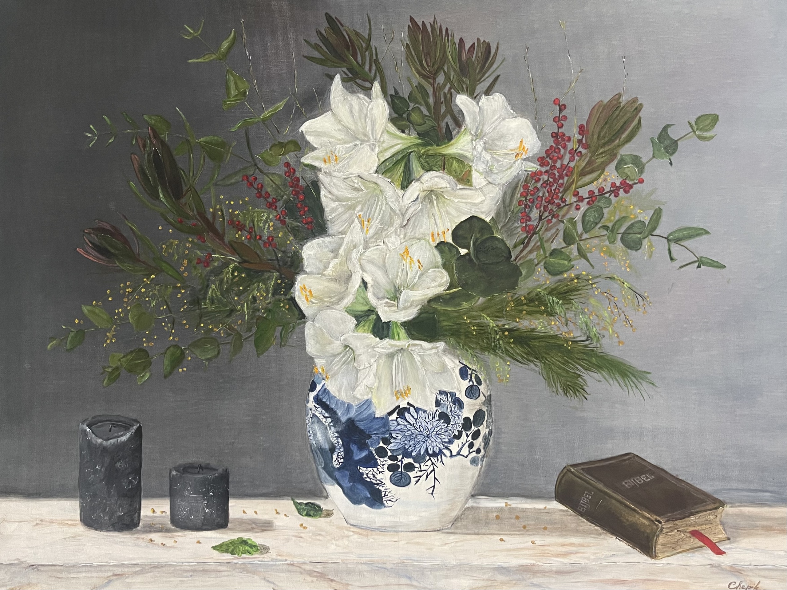 Uit de uithoeken van het huis kwamen de ingrediënten bij elkaar, de tabaksvaas, de bijbel van zijn grootvader en de kaarsen uit de kast, en natuurlijk verse lelies.