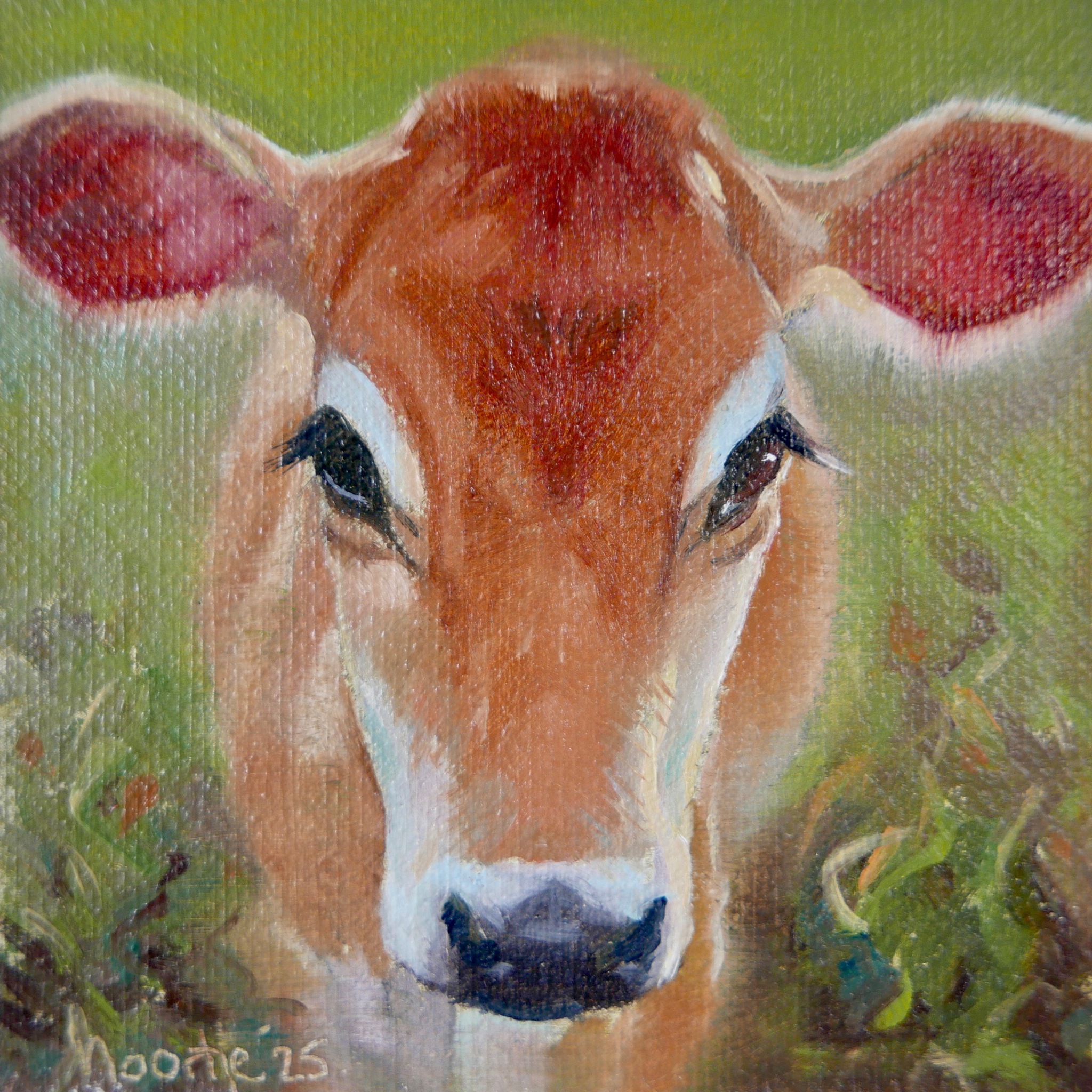 Heel bijzonder om cadeau te doen, dit schilderijtje van kalfje op een doosje waarin je een geheim kan bewaren, in een blankhouten baklijstje €125,-