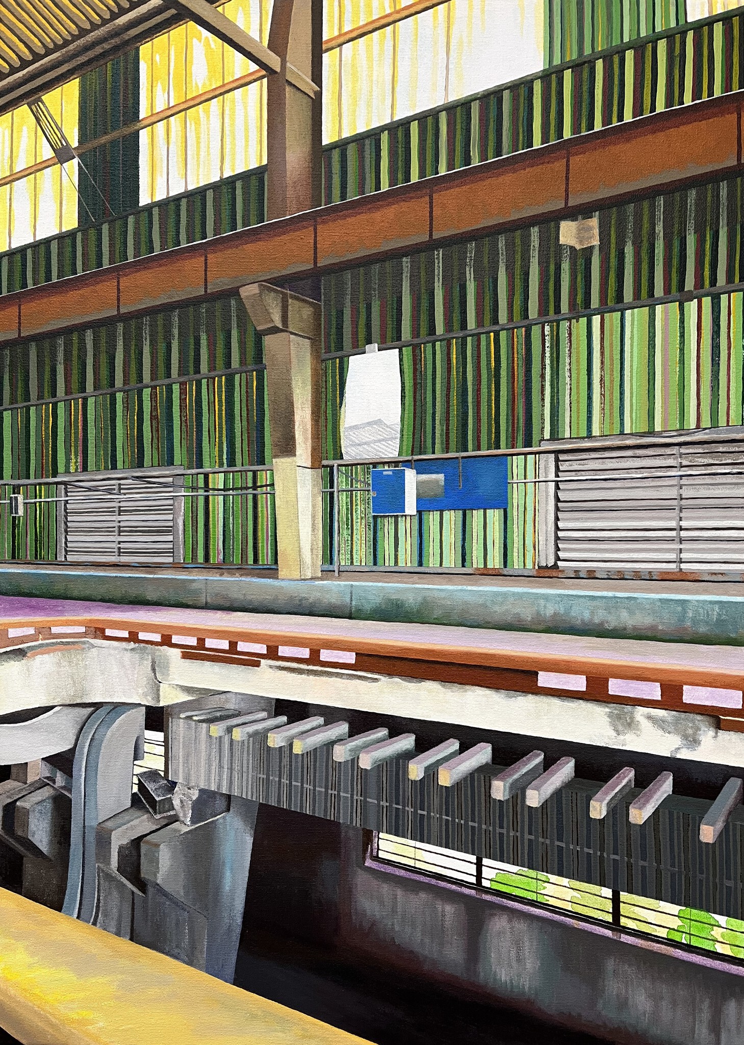 Het lijnenspel van de fabriekshallen van Aldel is een fascinerend uitgangspunt voor mij. De wanden, de plafonds, hoe meer ik kijk, hoe meer lijnen ik zie.