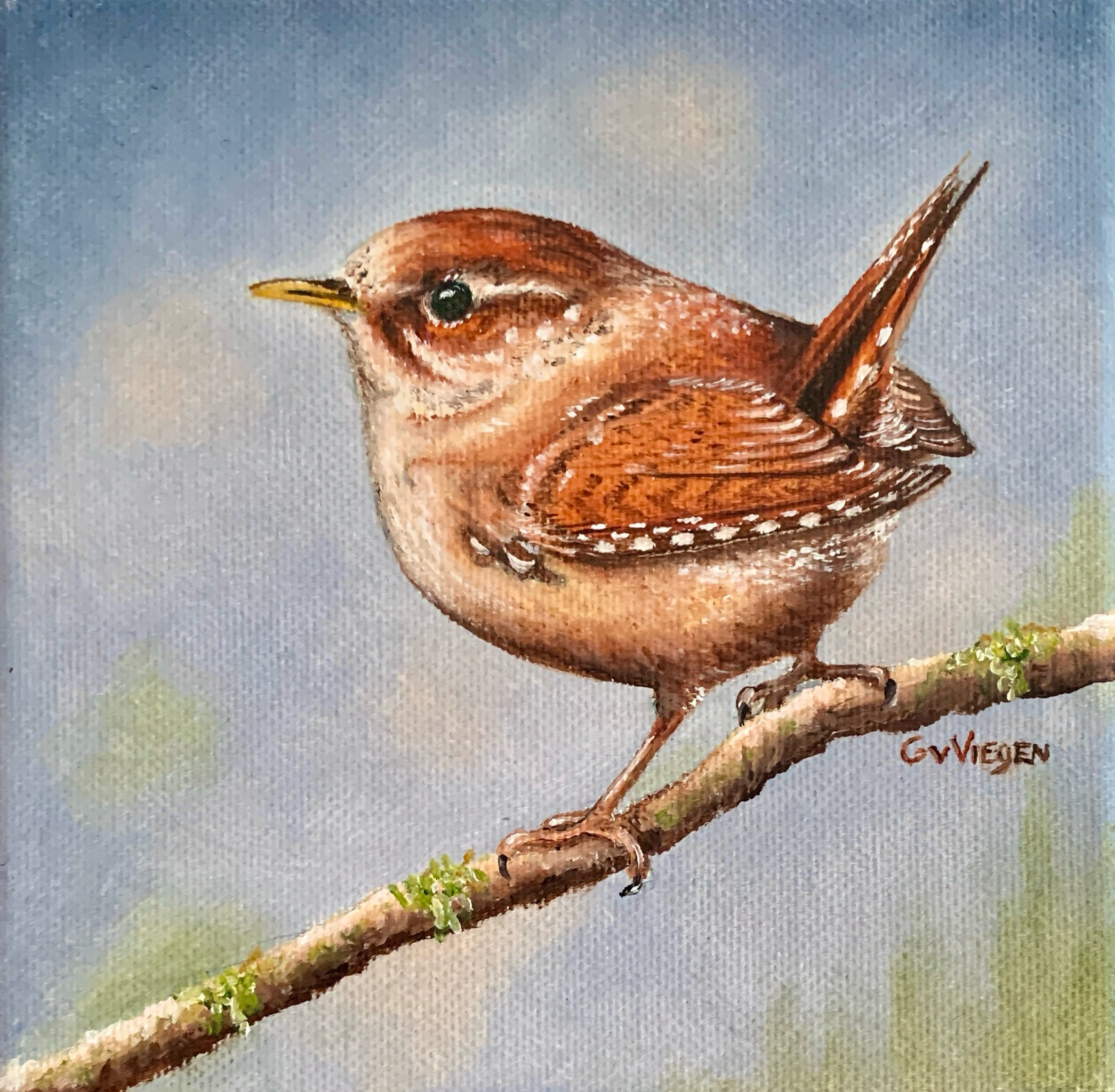Olieverf Doek Winterkoning Vogel Bird Realistisch Bruin Tak Natuur