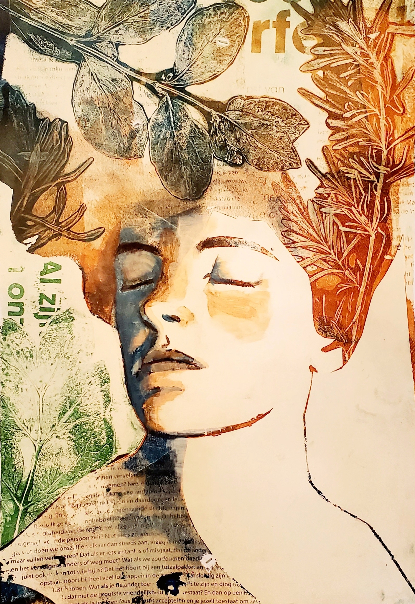 Portret gedrukt in acryl met gelli plate en bladeren