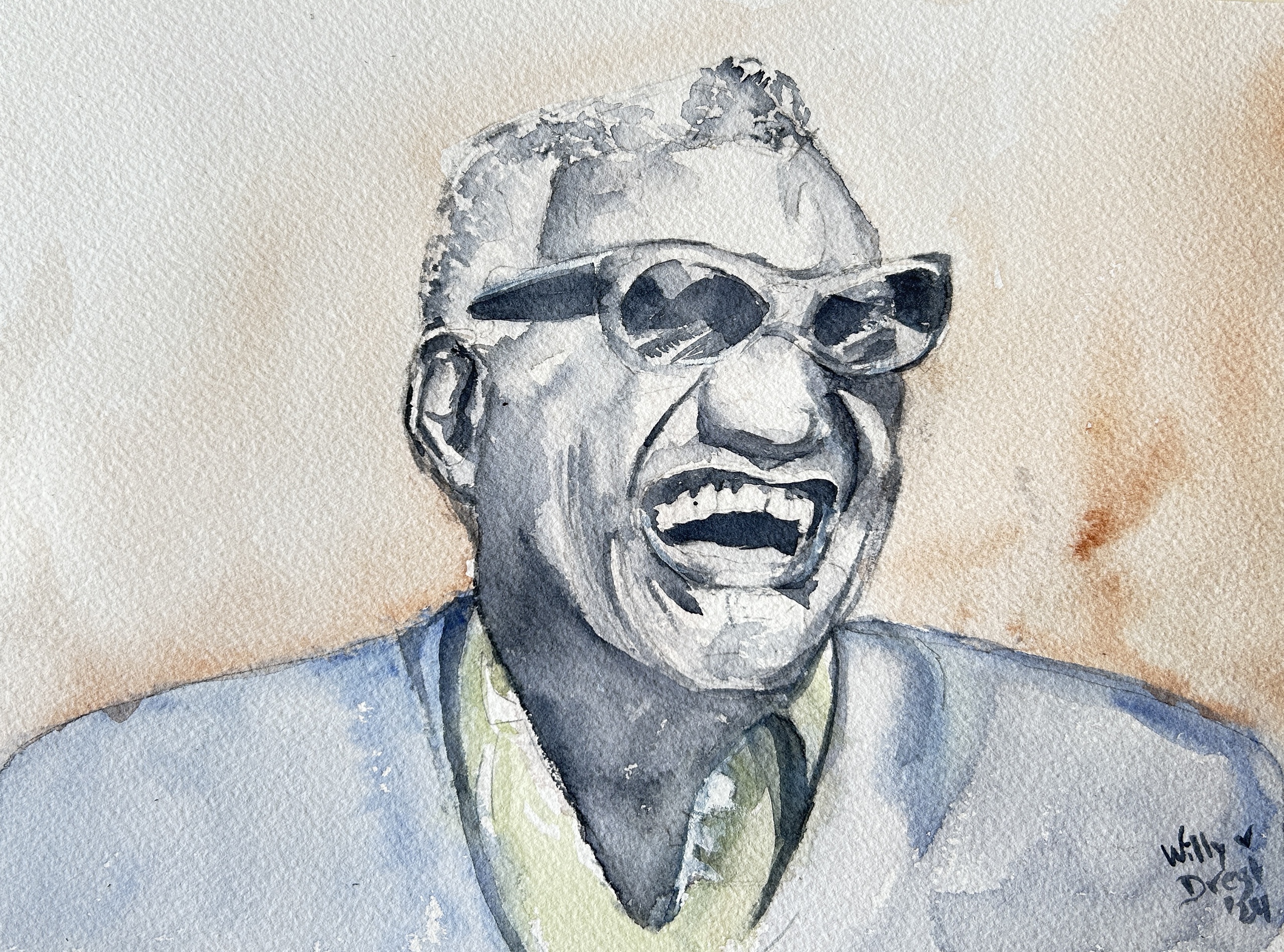 Aquarel Watercolor Portret Raycharles Muziek Kaart