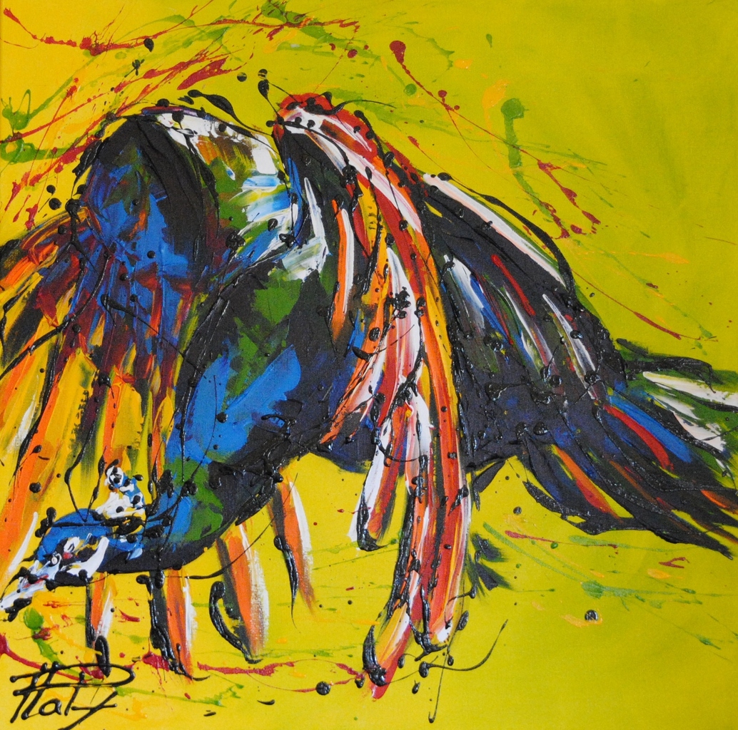 Schilderij Abstract Figuratief Kleurrijk Painting Pauw Vliegend Colorfull Flying Peacock