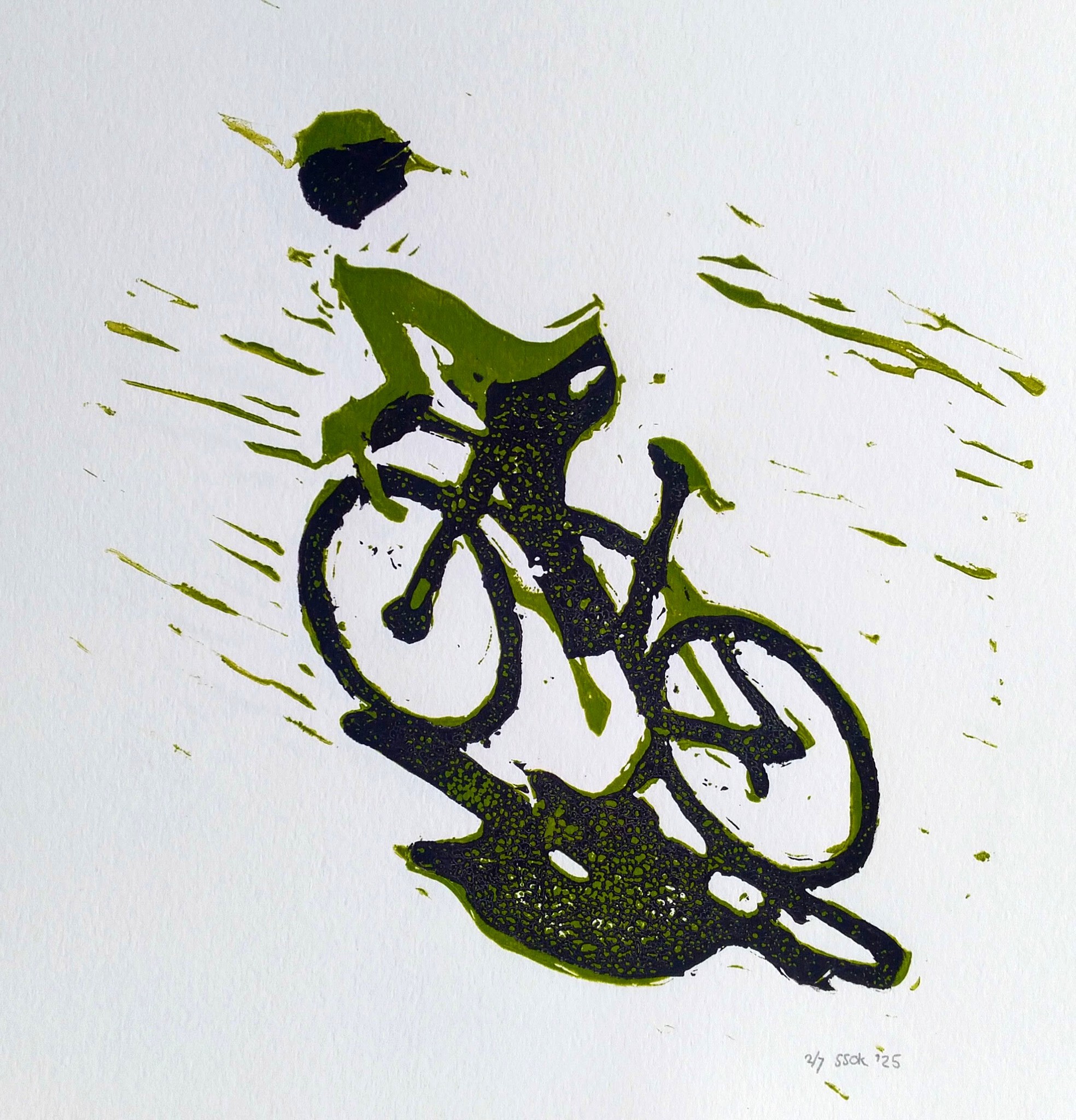 Deze wielrenner heb ik uitgegutst in klei en daarbij veel materiaal laten zitten, waardoor je bij het afdrukken veel van die gutssporen terug kunt zien.