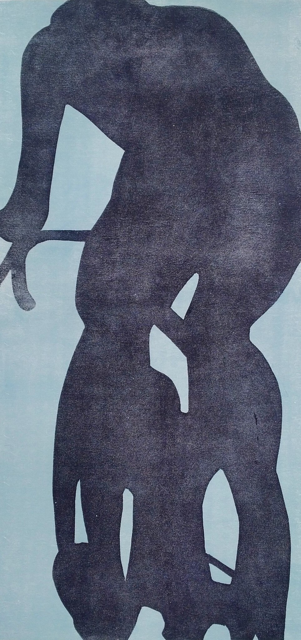 Een wielrenner bergop stoempend. Deze druk maakte ik met gesneden foamvellen. Eerst een rechthoekige afdruk in blauw en daarna de vorm van de wielrenner eroverheen.