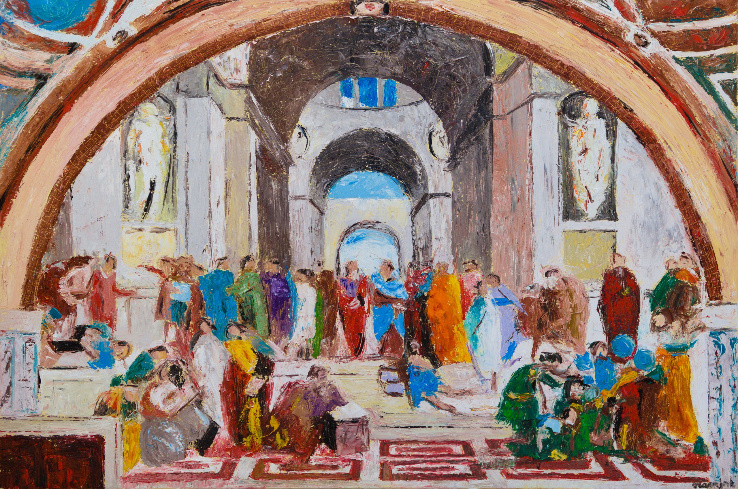 De wens was: schilder een vrije impressie van de fresco 'De School van Athene'. Dit is een fresco geschilderd door Rafael welke zich bevindt op een muur in Vaticaanstad. De opdrachtgever is een filosofisch ingestelde jongeman. Het schilderij is 80 x 120 cm groot.