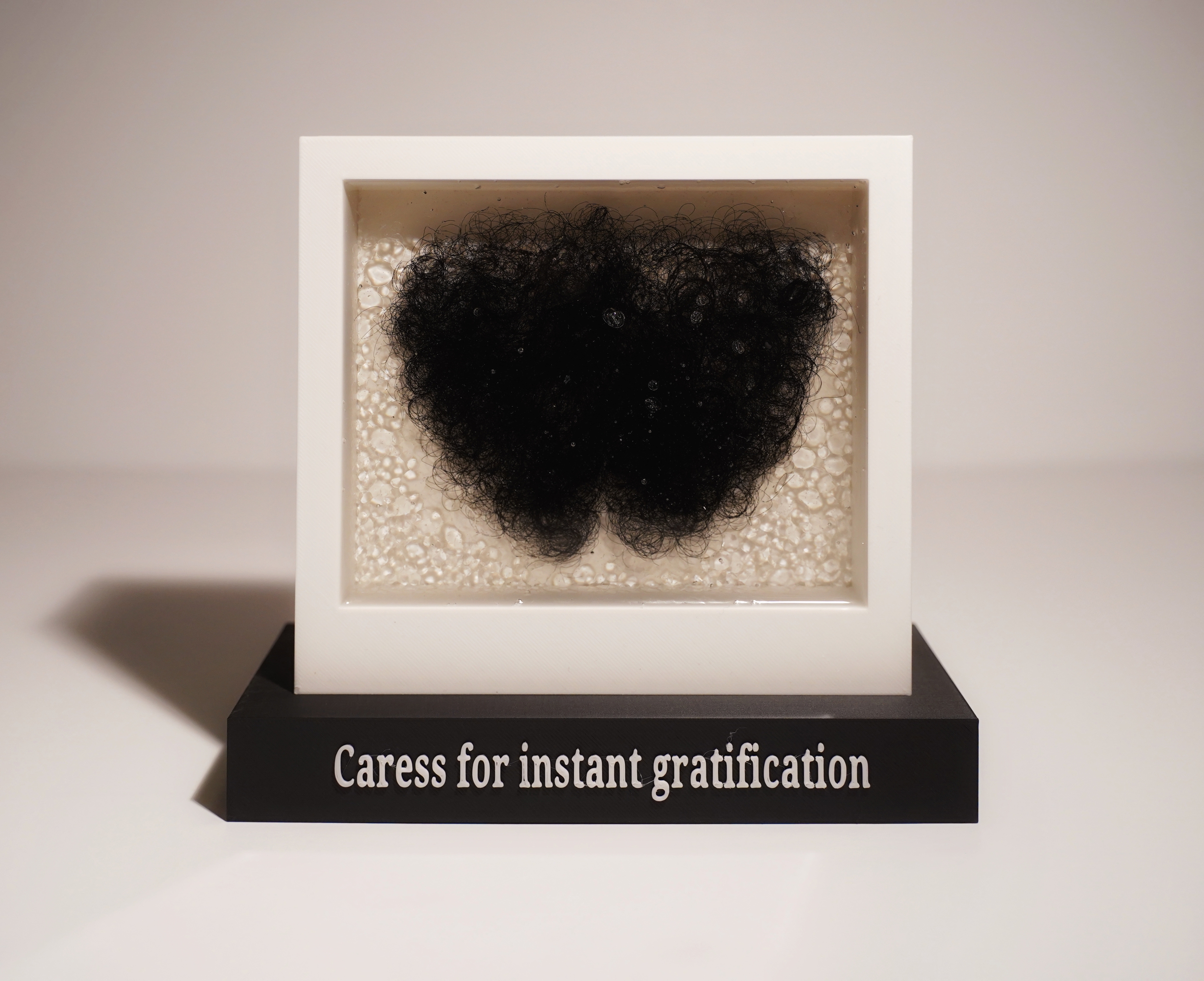 The work expresses the human urge for comfort and physical closeness — a longing that often provides only a fleeting satisfaction without truly dissolving loneliness. The encapsulated cluster of hair, preserved in resin, becomes a relic of intimacy: a fossil of touch, stripped of warmth, scent, and reciprocity. The text on the base reads like both a consumer slogan and a scientific label, exposing the fragility of desire and the commodification of human connection. The piece reflects on the tension between longing and fulfillment, between the illusion of intimacy and the unbridgeable solitude that defines the human condition.