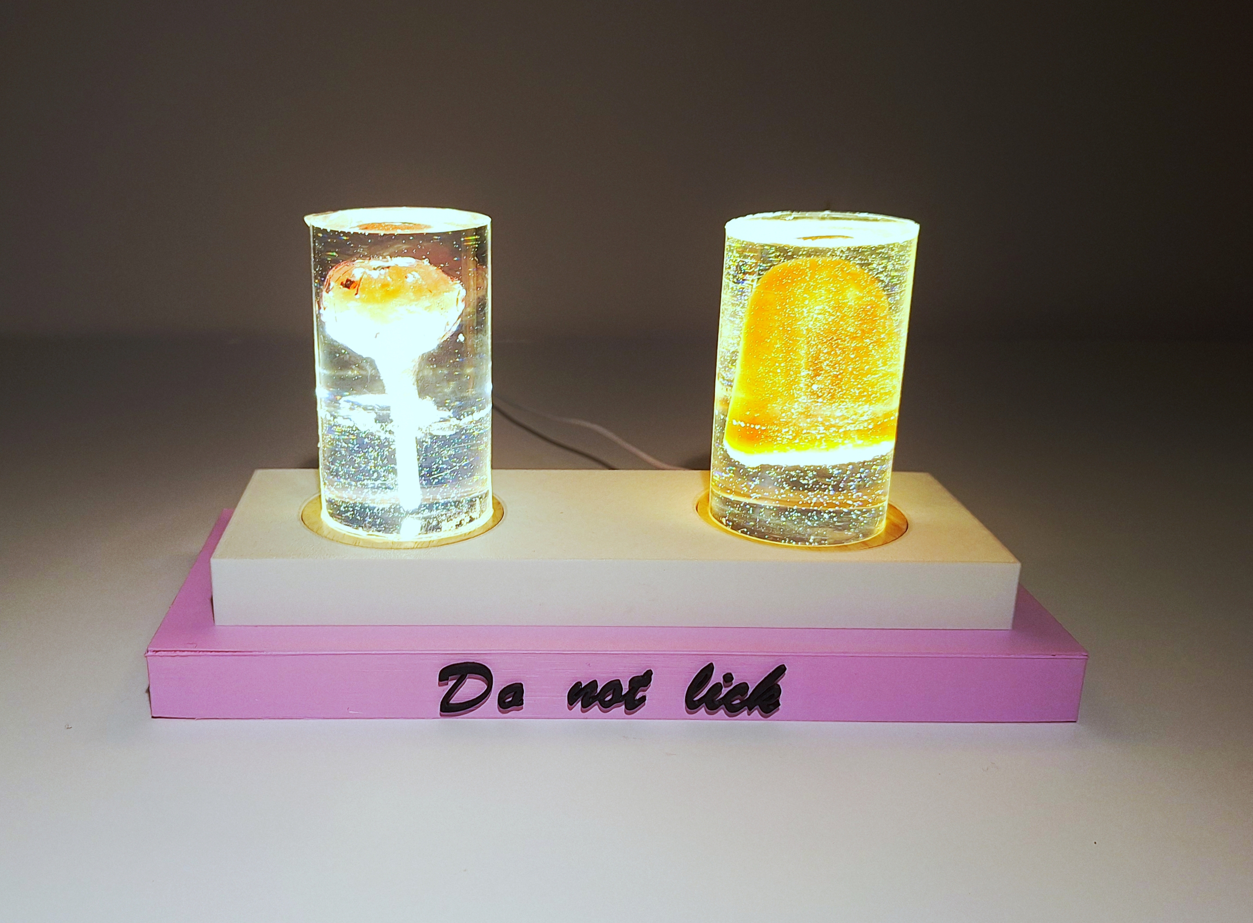This installation isolates and suspends an everyday scenario: a tongue poised to lick a lollipop. Encased separately in transparent resin, the lollipop and the silicone tongue are immobilized at the very moment where contact and fulfillment are anticipated but indefinitely postponed. By freezing this familiar micro-event, the installation makes visible the automatic associations and causal expectations the mind produces involuntarily. The viewer intuitively completes the scene, projecting taste, pleasure, and satisfaction, even though no material action can occur. Anticipation thus emerges as an autonomous phenomenon, detached from physical execution. The instruction “do not lick”, written on the pink plinth, functions simultaneously as prohibition, absurd reminder, and institutional command. It echoes parental discipline, museum etiquette, and moral regulation, reinforcing the tension between desire and restriction. The work stages desire not as excess or transgression, but as something regulated, displayed, and rendered unusable. Frozen Desires reflects on how contemporary experience increasingly consists of deferred gratification, mediated encounters, and desires preserved as images or objects rather than lived sensations. Desire remains present, glowing and precise, yet permanently out of reach.