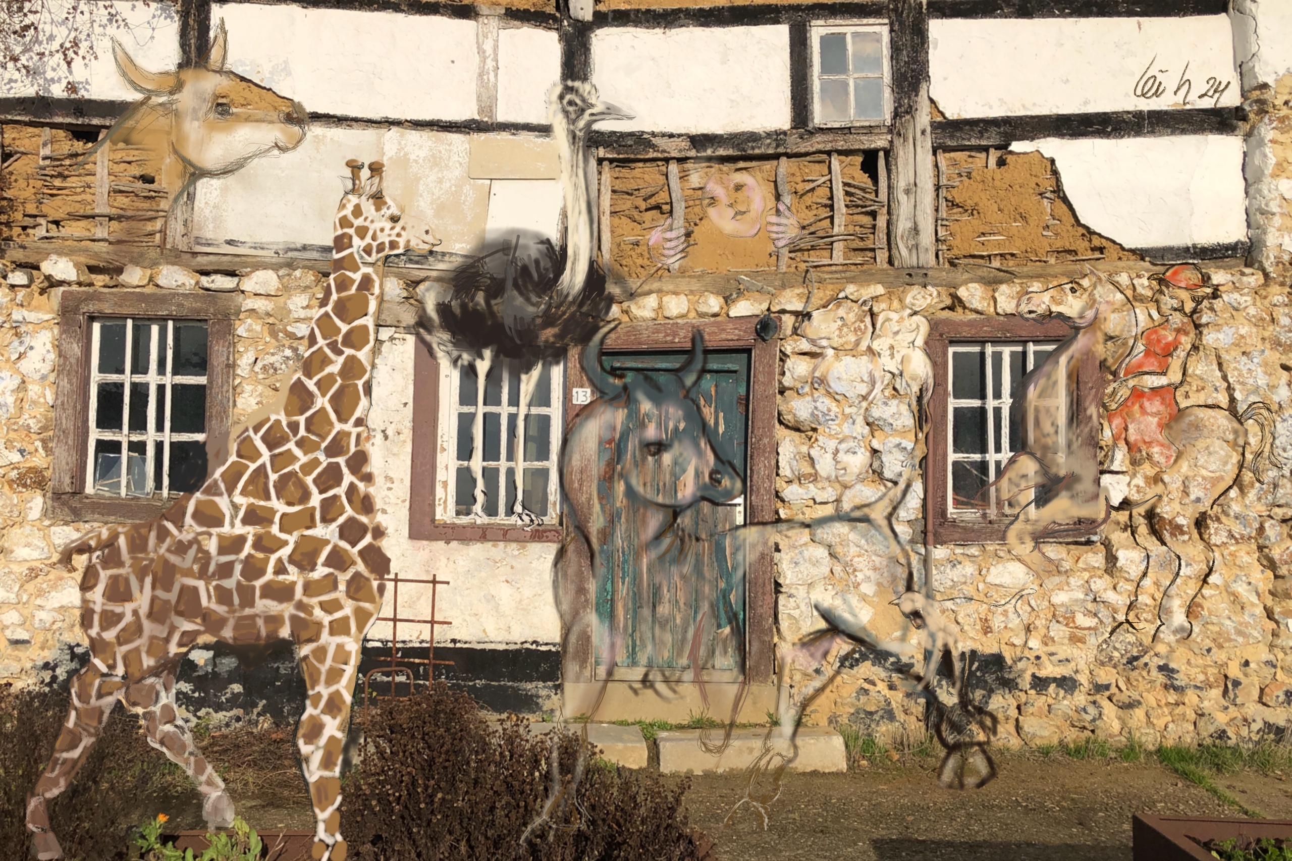 "It's all about fantasy" is hier wel helemaal van toepassing! Een gevel van een vervallen vakwerkhuis was het uitgangspunt. Paradijsvogels is de naam van de locatie (Cotessen-Vijlen). De vogels waren gevlogen. Ik heb ze digitaal erin getekend en geschilderd.