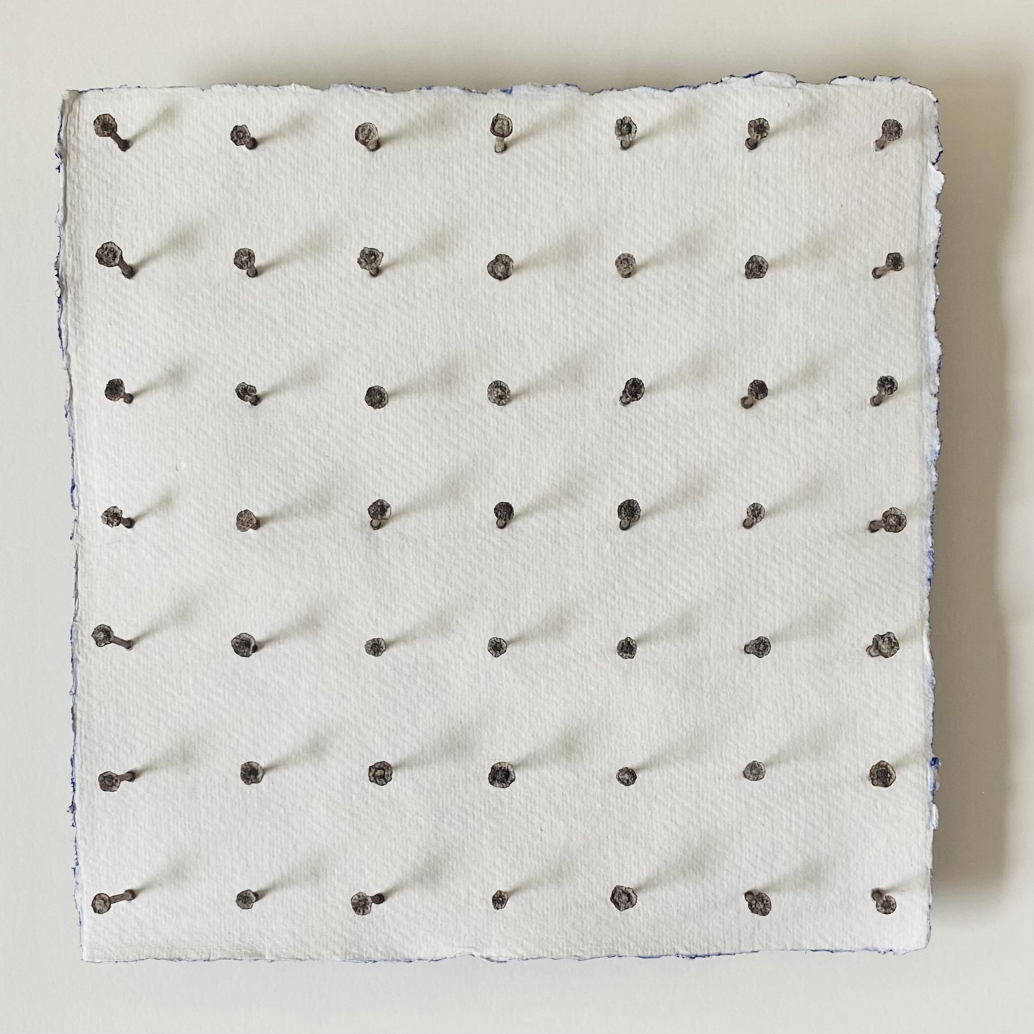 Gemaakt van de verhoute stampers van de Cistus. De stampers steken als spijkers door het handgeschepte papier. De achterkant van het werk is blauw en weerkaatst subtiel op de lichte achterwand. Het werk zit in een kras werende lijst van plexikglas waardoor de zijkant van het werk goed zichtbaar is. (afbeelding is zonder lijst)