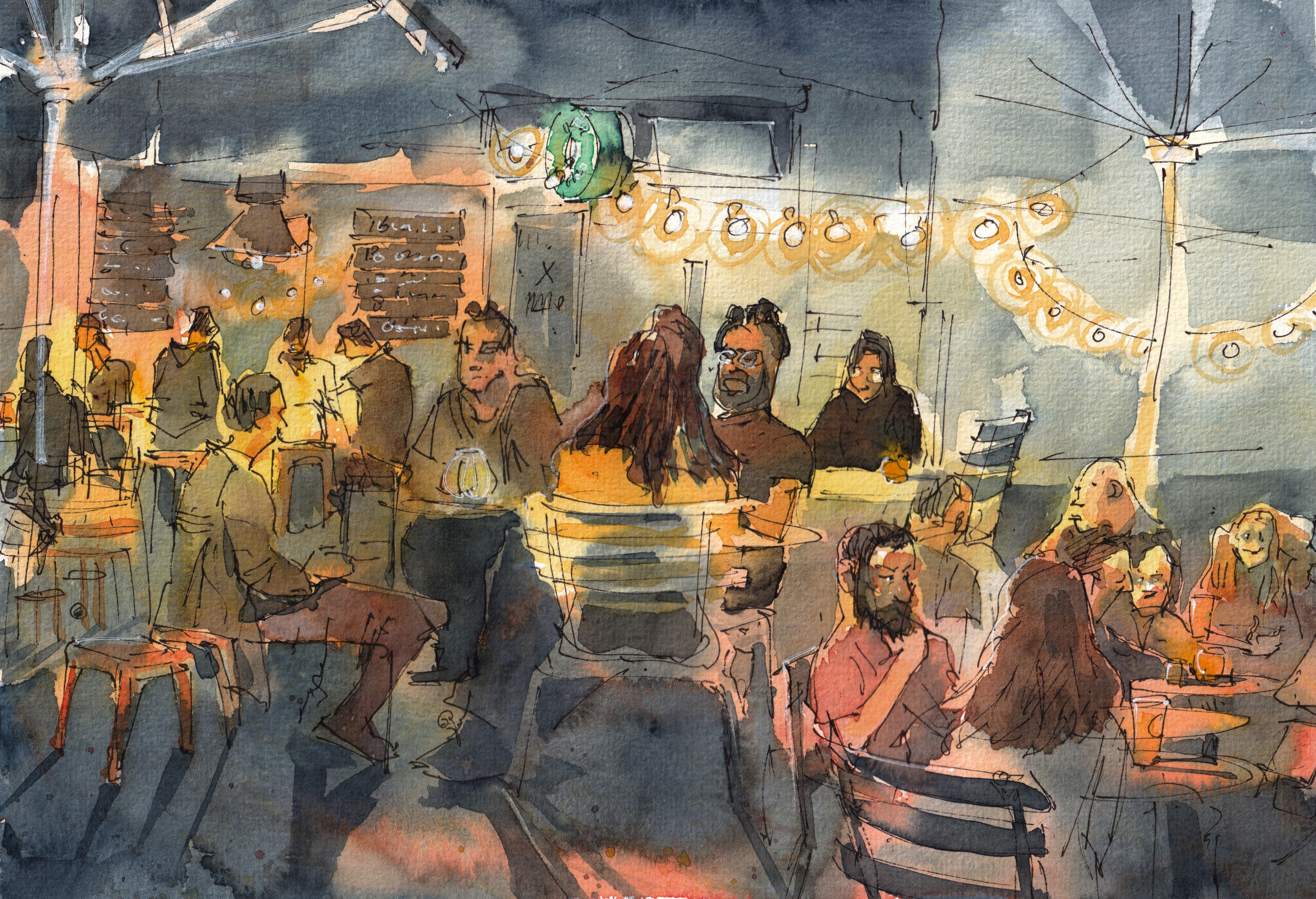Het is goed toeven bij Kompaan Binnenhaven, Den Haag. (Ik heb er ooit een bier van 25% gehad. Daar heb ik helaas geen schilderijtje van kunnen maken...) Een warme zomeravond op het terras. Proost.
