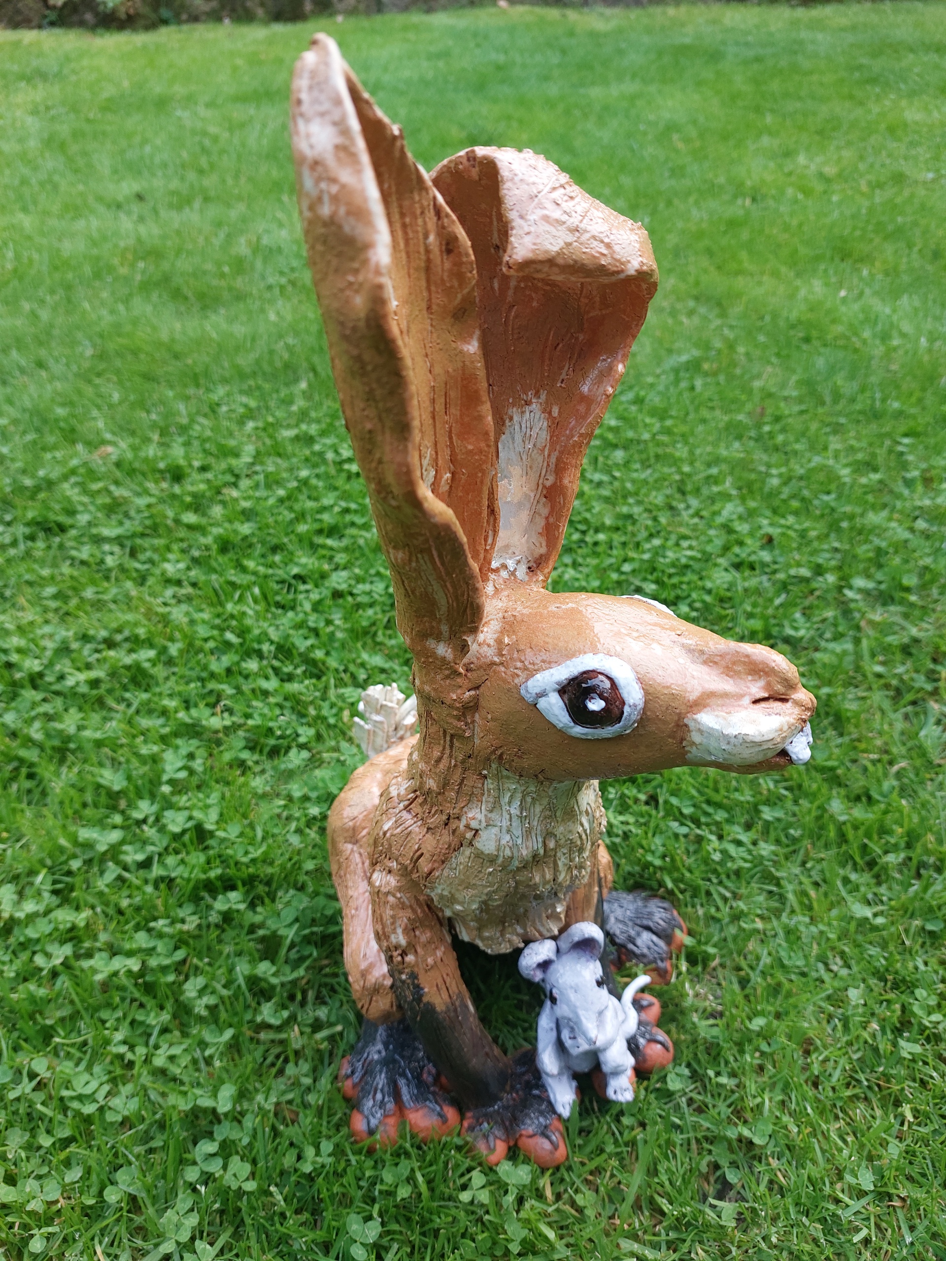 Deze haas heeft een grijze muis en is met verschillende kleuren geglazuurd en heeft een mooie glans.