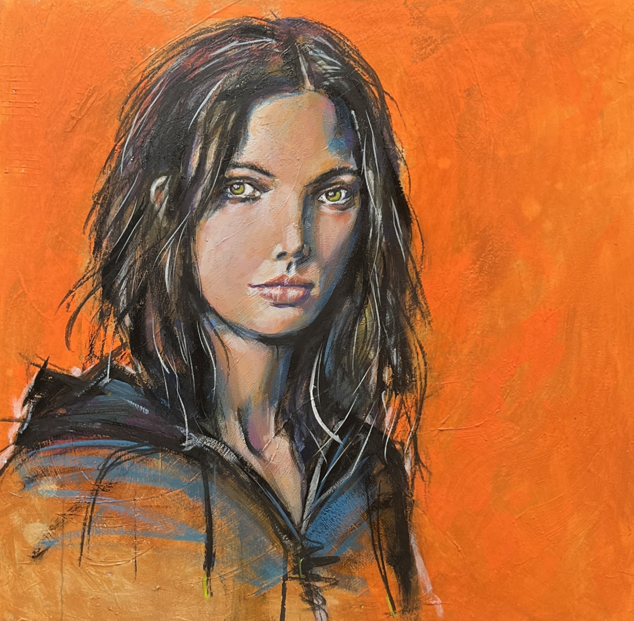 Portret op canvas, gemaakt met acrylverf en houtskool.