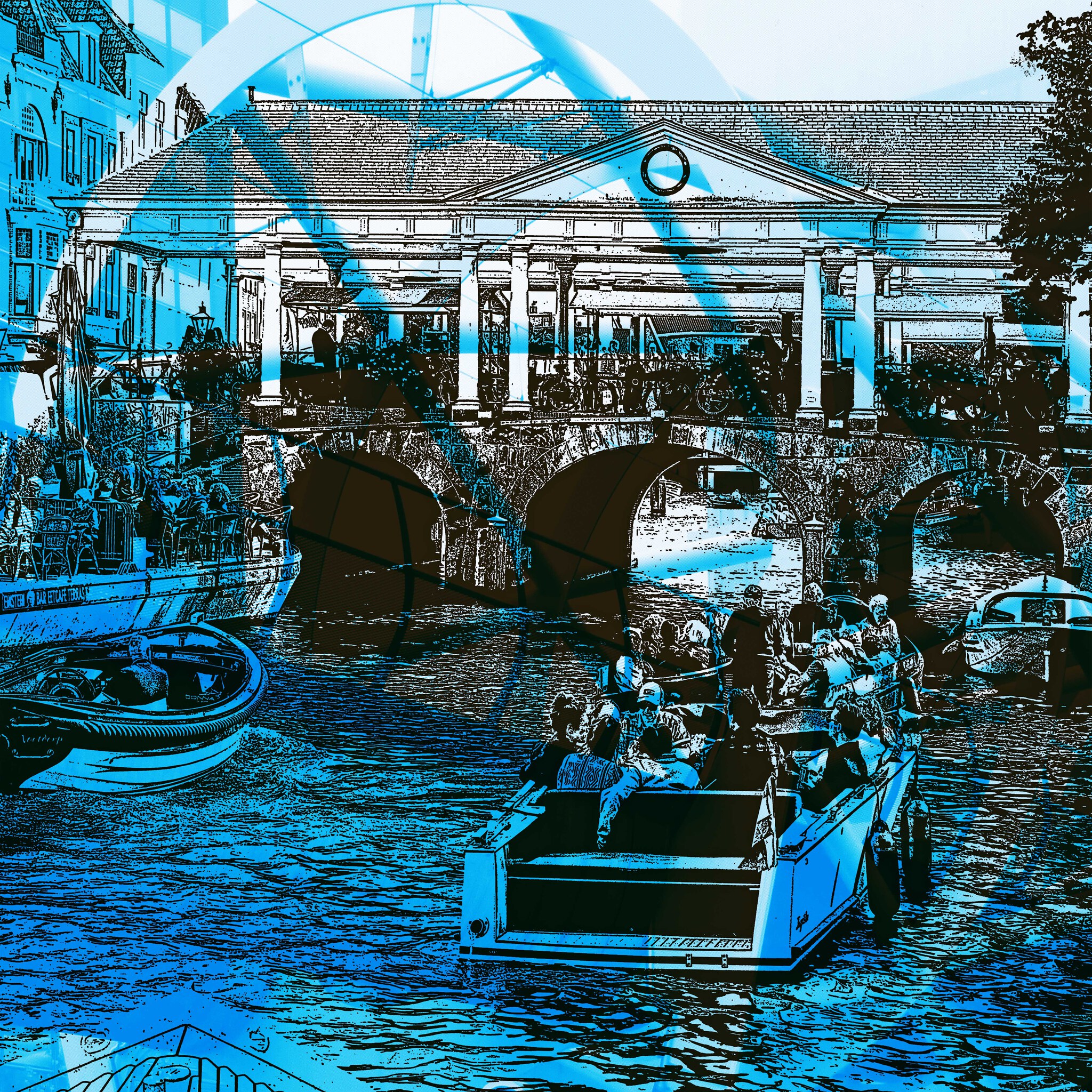 'De Koornbrug, Leiden' Mensen op de boot in het water. * te koop digitale art print, 50 x 50 cm, prijs: € 365 (inclusief lijst, of op dibond) (diverse formaten zijn mogelijk, naar uw wens - de prijs variëert dan mee)