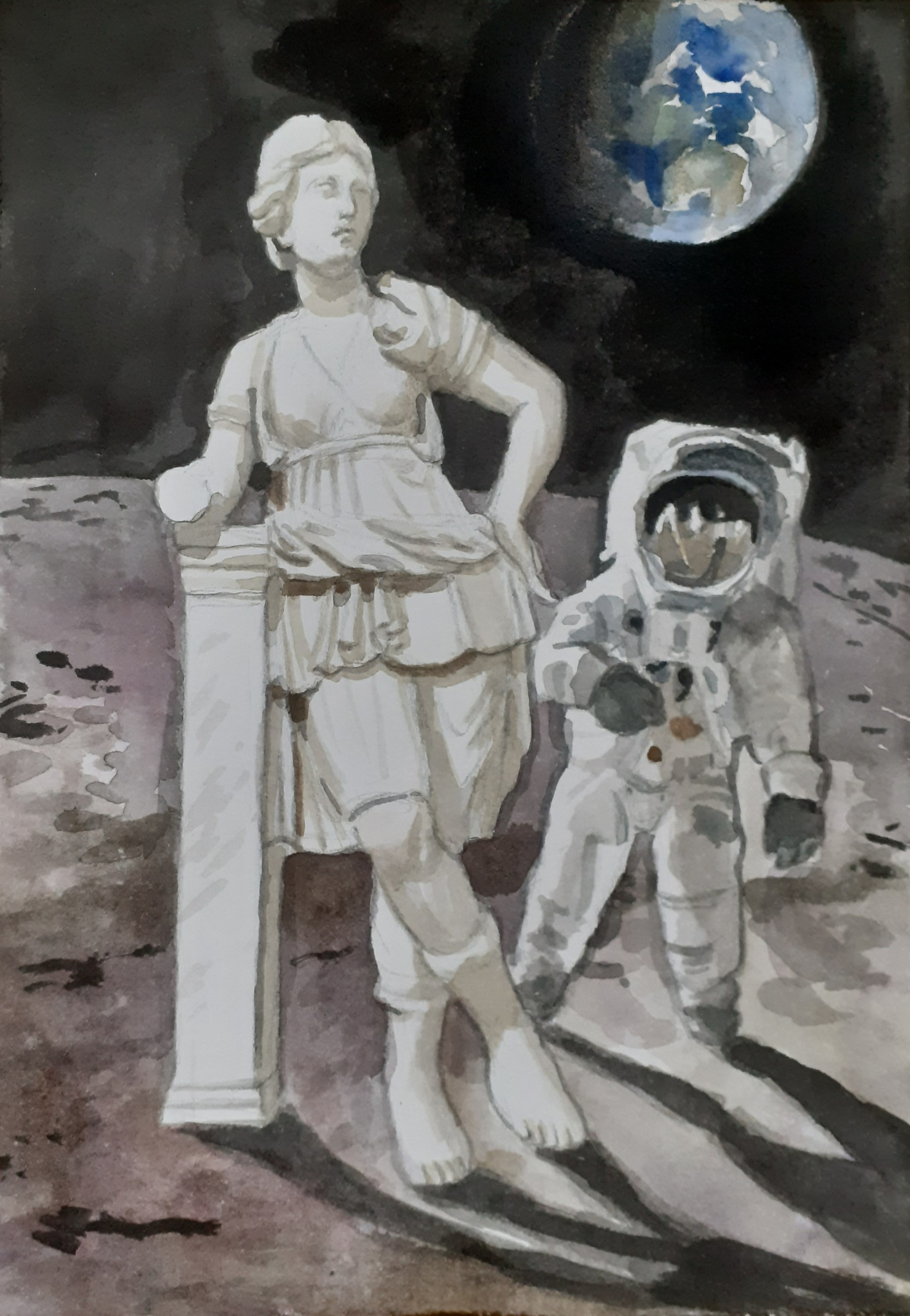 Aquarel van Artemis en een man op de maan