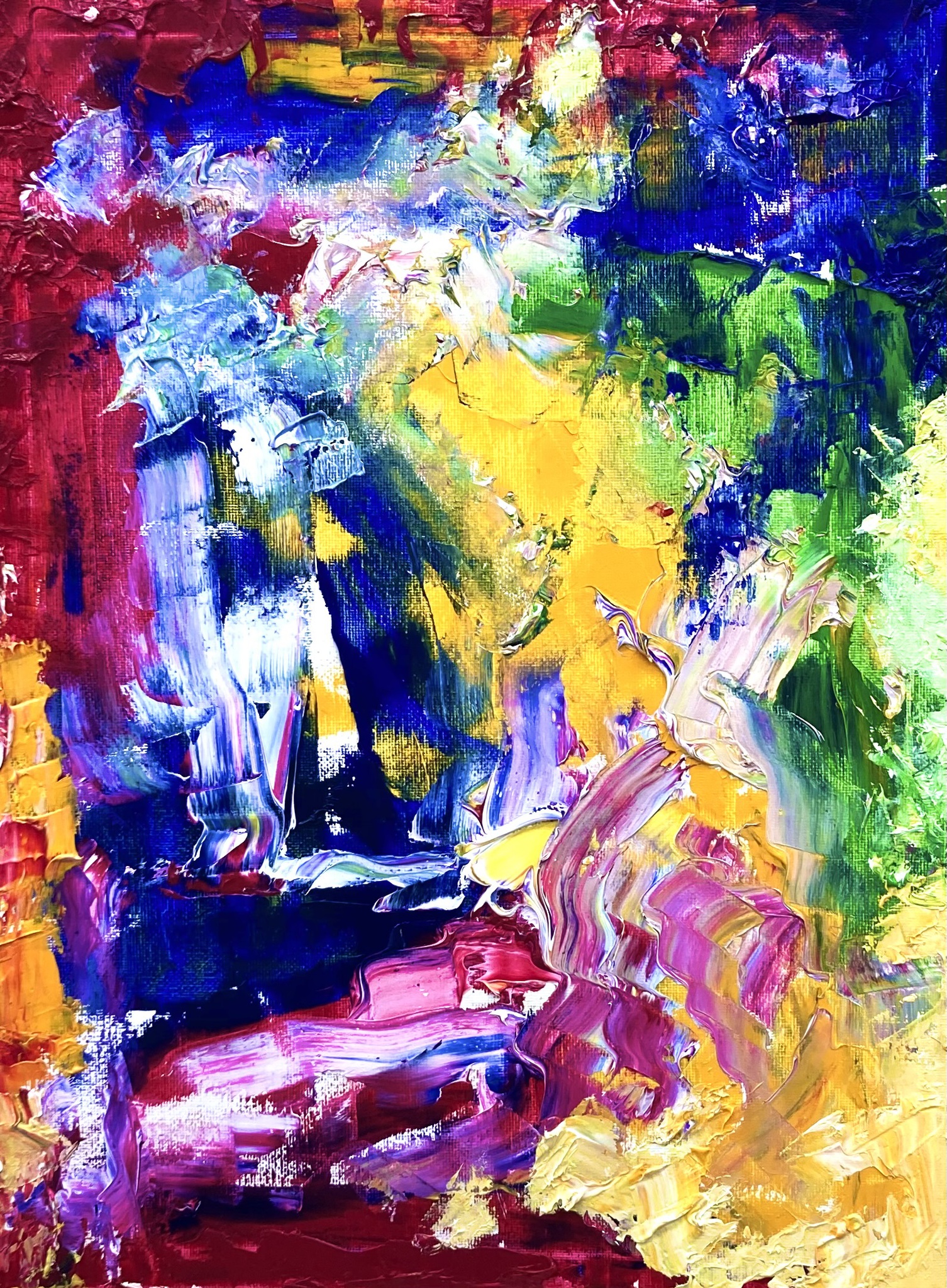Schilderij Abstract Rood Oranje Geel Landschap Blauw Paars Groen Kleurrijk Olieverf Bergen Roze Bos Lila Grot Expressionisme Yoga Mindfulness Zen Meditatie Thuiskomen