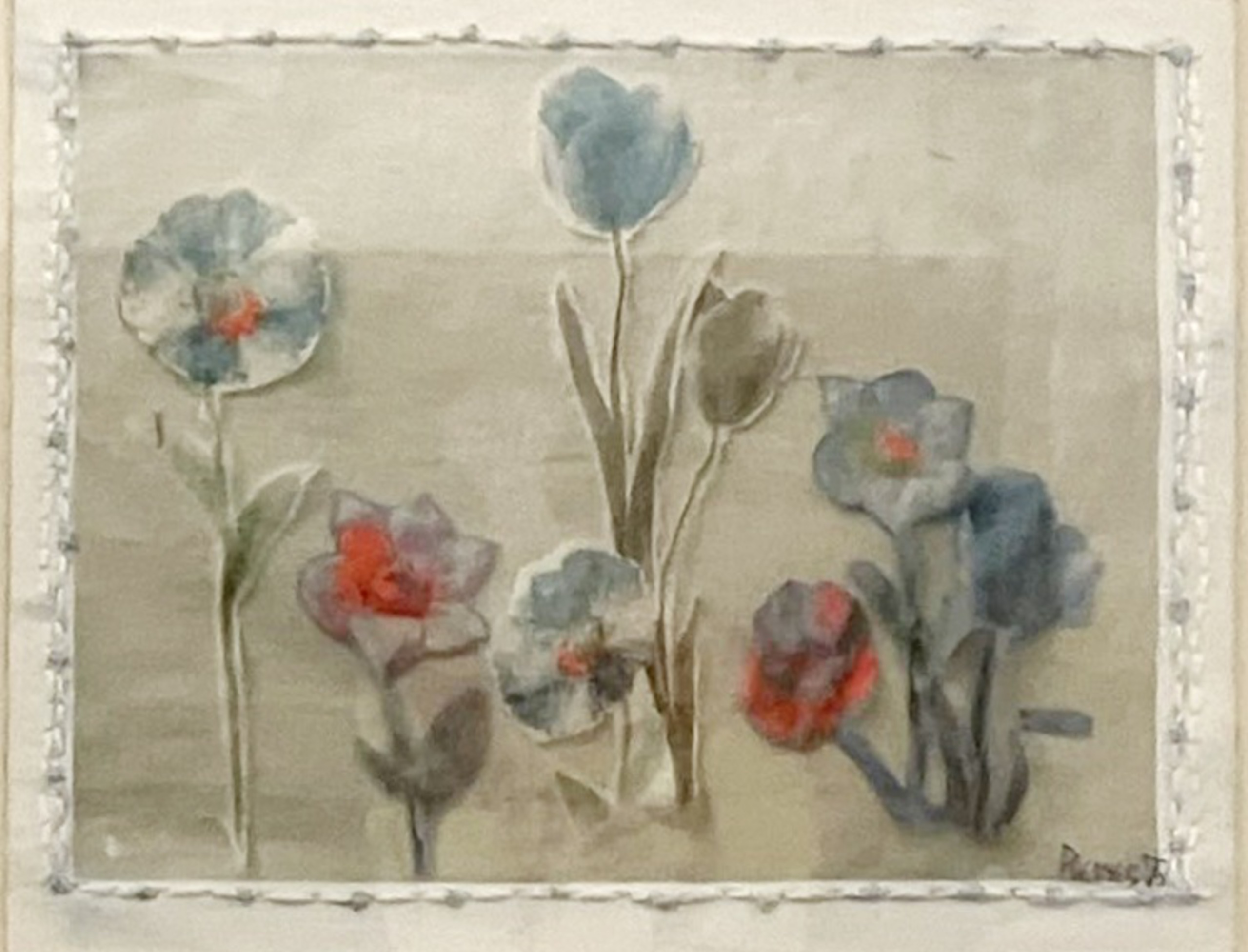 transfer van foto van deel bloemenproject en borduurwerk op linnen in lijst
