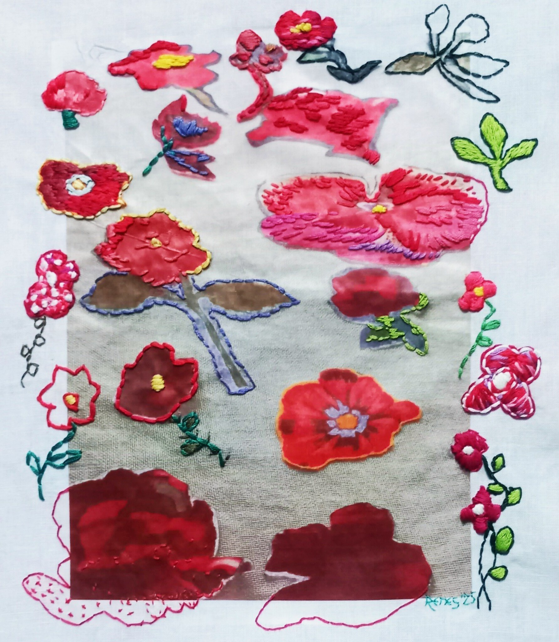 transfer van foto van deel bloemenproject (geknipte bloemen uit textielverzameling) en borduurwerk op linnen in lijst