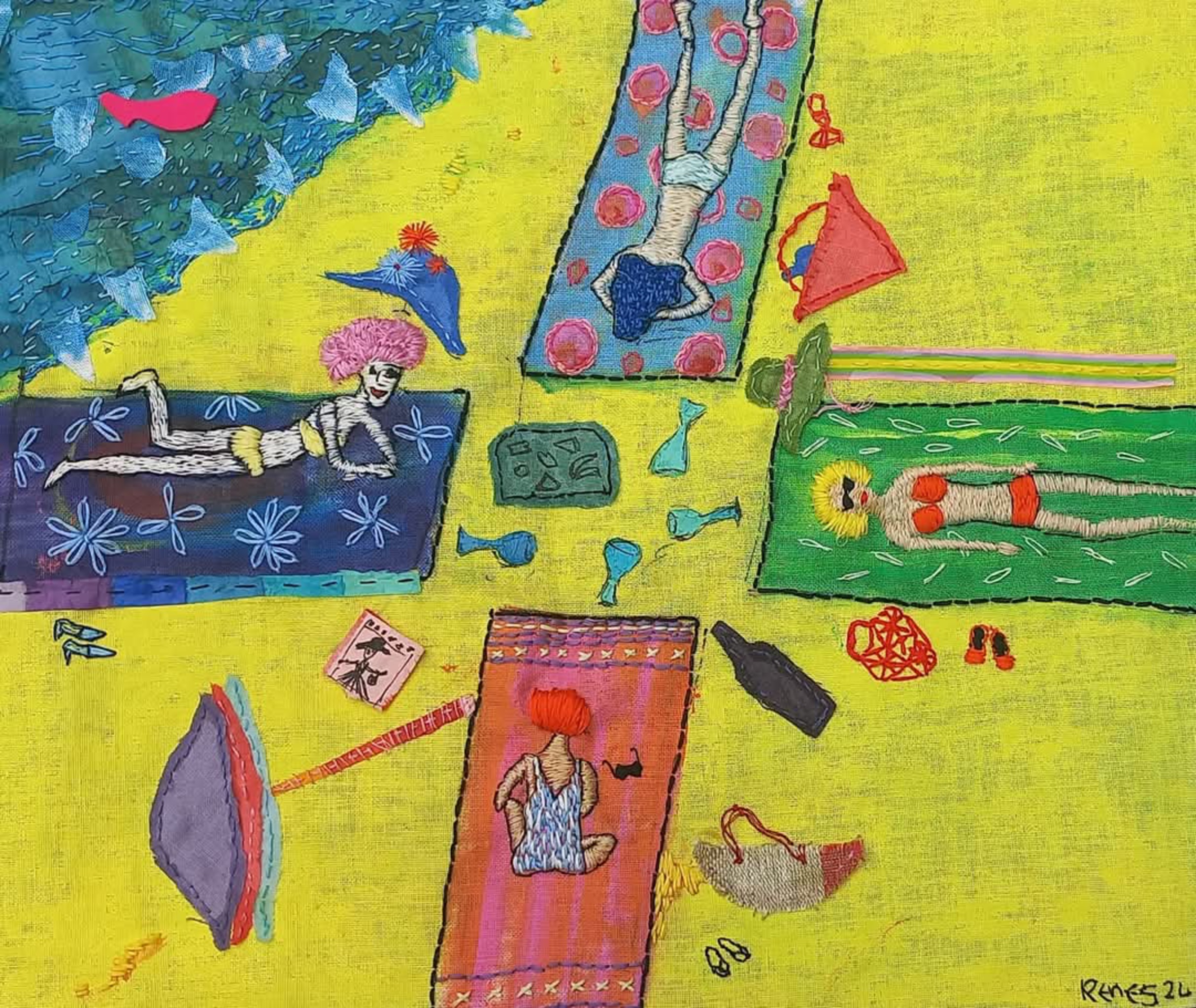 mixed media (textiel, papier, verf, borduurwerk) op linnen van strandtafereel geinspireerd op een tekening die ik lang geleden maakte in bijpassende blauwe lijst