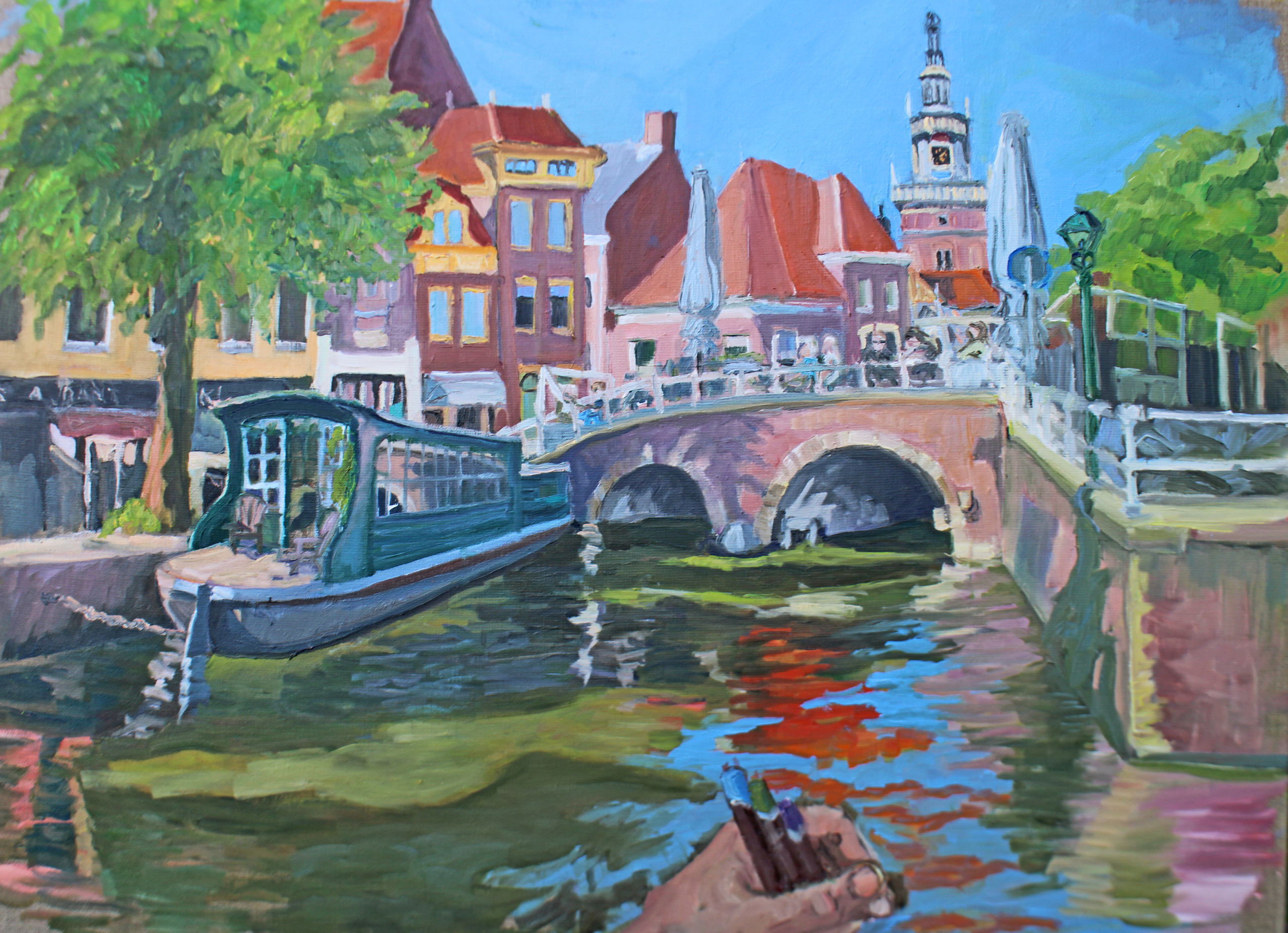 Idee is mezelf weergeven terwijl ik een tekening maak van wat ik zie. Voor de expositie Imagine/145 wilde ik eigenlijk de beperkte blik tonen die je hebt als je probeert weer te geven wat je ziet. In dit schilderij doe ik dat door het uitzicht dat ik aan het tekenen ben af te beelden én tegelijkertijd de hand, die de potloden vasthoudt. Je kunt eigenlijk niet precies weergeven wat je ziet. Je maakt een keuze: of dat wat veraf is, of dat wat dichtbij te zien is, daar kijk je naar. Ondertussen mis je veel informatie, die je niet ziet. Als kijker en afbeelder kun je niet anders dan jouw blik beperken.