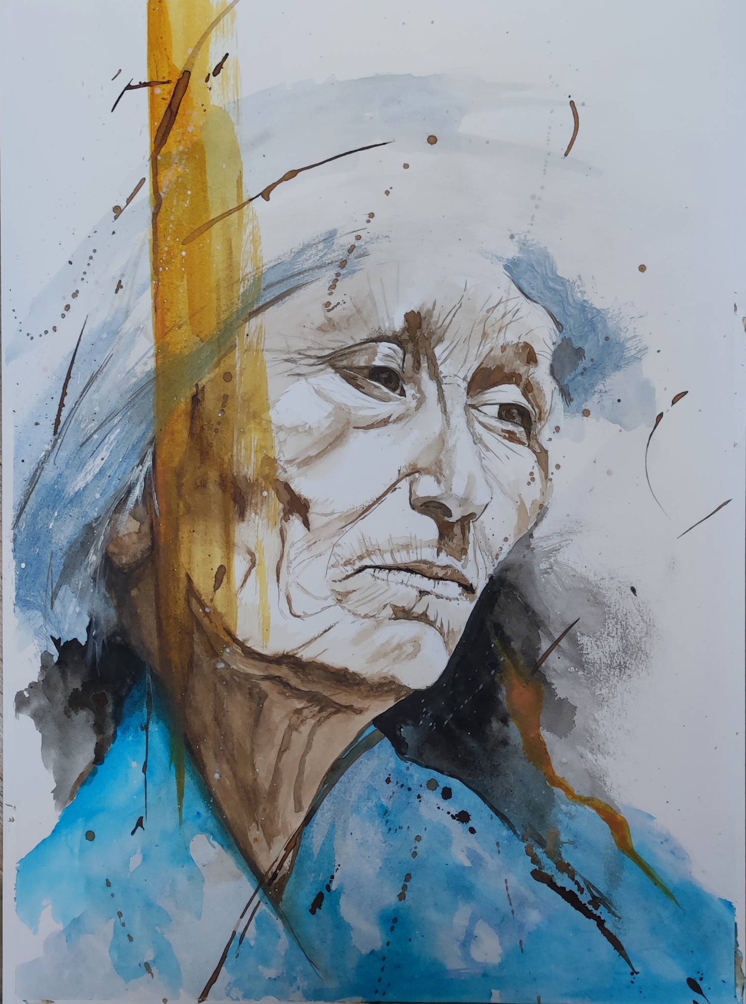Dit portret toont de sporen van een lang leven - niet als last, maar als getuigenis. Een oranje band breekt door haar gelaat als een teken van vreugde, warmte en optimisme. Een blauwe sluier als een mantel van rust, wijsheid en bescherming