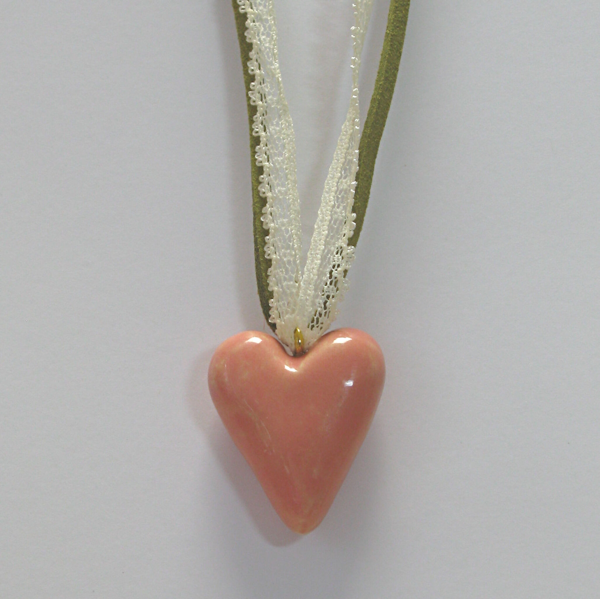 uniek 'collier' van geglazuurde keramieken hart en een bijpassend uit diverse sierstrengen bestaand 'lint'. opgegeven afmeting van de hanger is bij benadering; de lengte van het lint is ongeveer 60 cm. let op: retourneren kan alleen bij ongebruikt en onbeschadigd