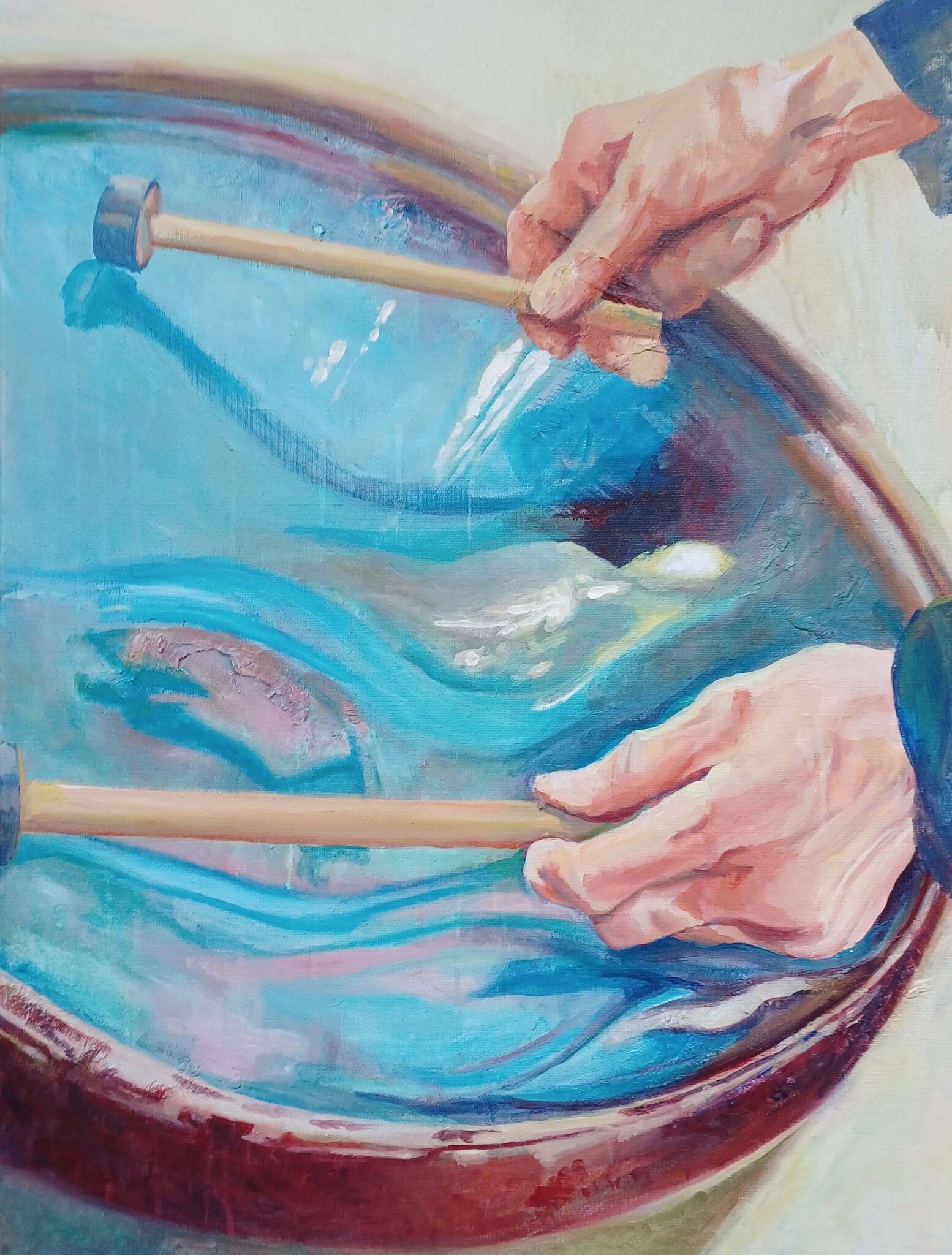 In de serie van handen met muziekinstrumenten is er weer een bij. Het zijn de handen van Paul de Ridder met steeldrum. Een instrument dat van oorsprong uit het Caribische gebied komt. De eerste steeldrums werden op Curaçao gemaakt van oude olievaten (van de Shell raffinaderij destijds). Paul heeft een zogenoemde meditation steeldrum, gestemd in een mineur pentatone toonladder, Fm.
