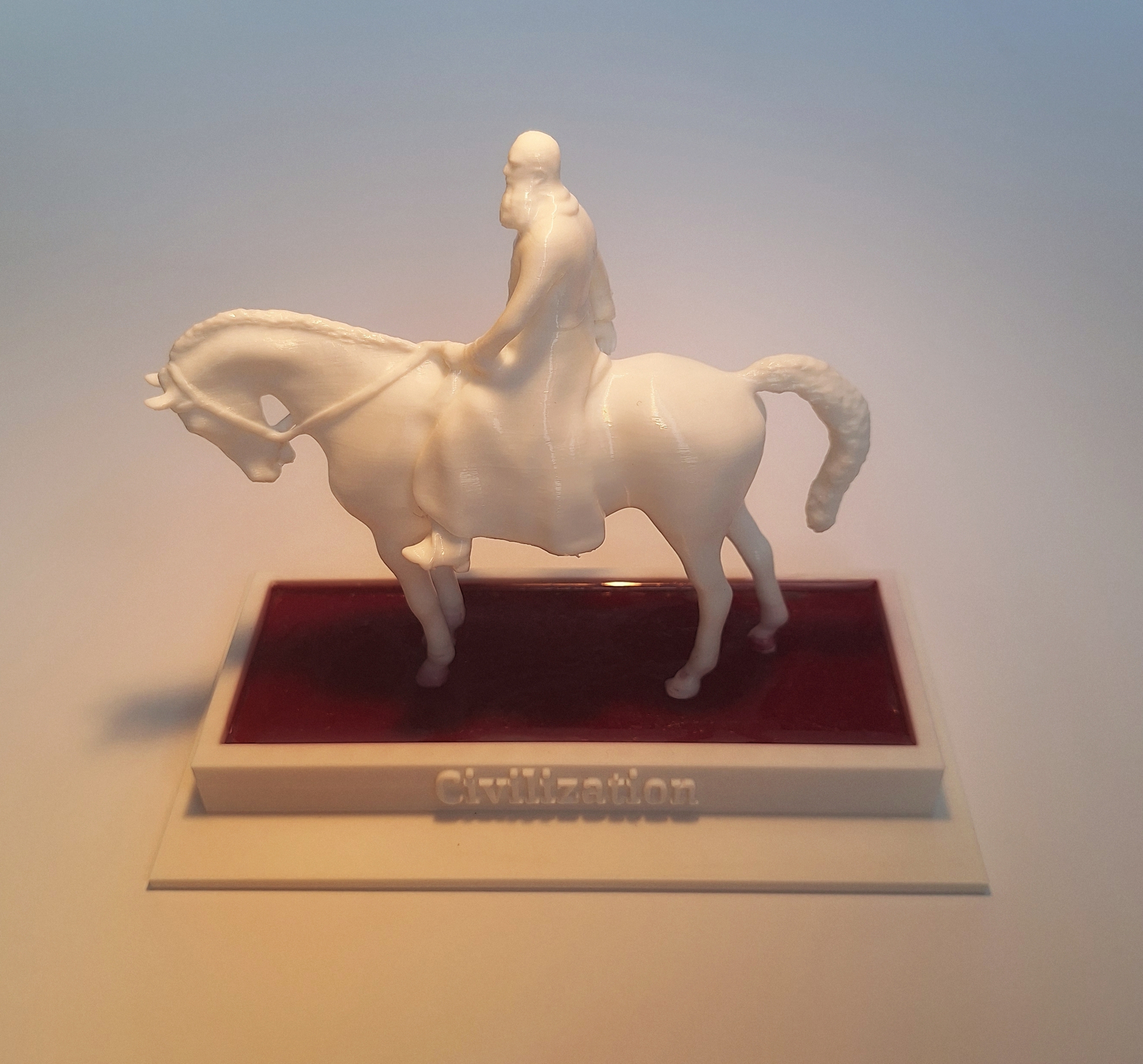 Civilization is a miniature equestrian sculpture referencing the numerous public monuments of King Leopold II that still populate Belgium’s urban landscape. The work depicts a white rider on horseback, rendered in glossy white 3D-printed material that evokes a sterile, museum-like purity. The surface of the pedestal is filled with a deep red resin layer, symbolizing the bloodshed caused by the colonial regime of the Congo Free State (1885–1908). By reducing the monument to a small, almost toy-like scale, the work undermines the traditional monumentality and heroism typically associated with such statues. The engraved term “Civilization” on the front side highlights the colonial narrative of a “civilizing mission,” confronting the viewer with the dissonance between the official myth and the historical reality of violence, exploitation, and racial domination. Civilization questions how collective memory is constructed, sanitized, mythologized or erased — and how the aesthetics of monuments contribute to the normalization of historical crimes.