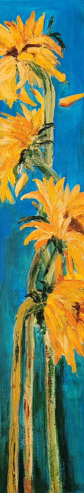 Mijn bijna uitgebloeide zonnebloemen geschilderd op een een smal maar wel een lang doek.