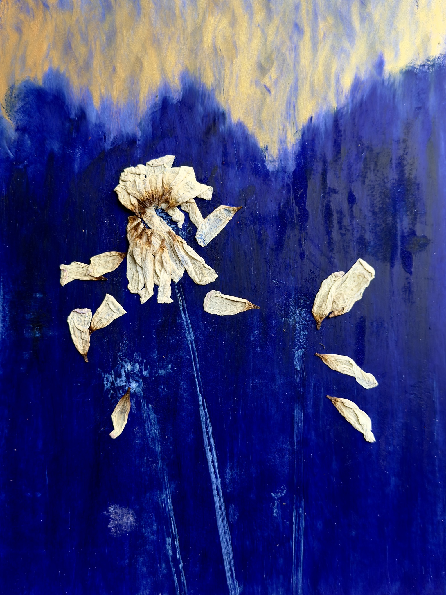Mixed media on paper — oil pastel and real dahlia petals 21 x 29,7 cm 2025
