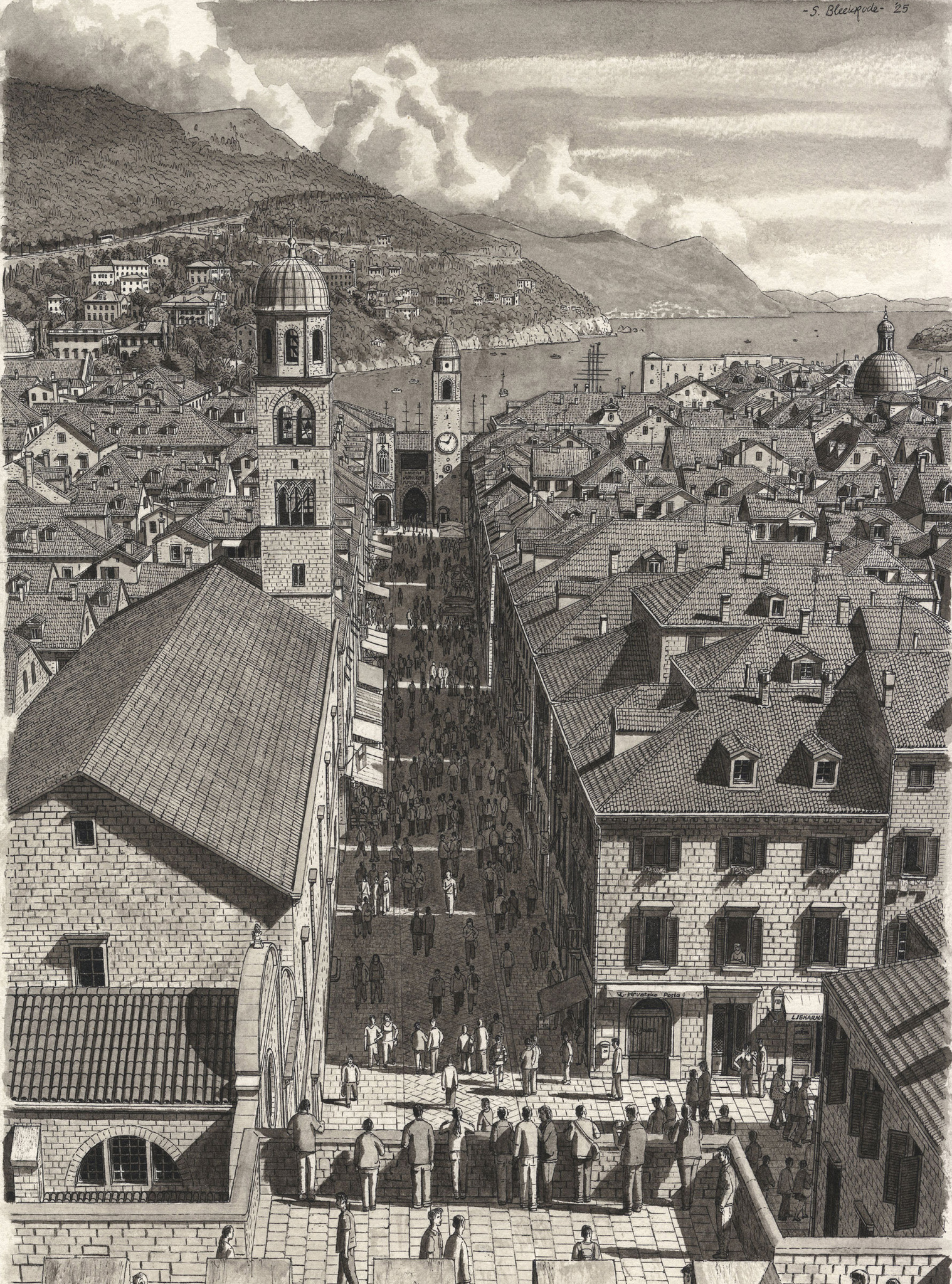 Dubrovnik Kroatië Croatia Tekening Drawing Art Kunst Kunstwerk Aquarel Watercolor Stad City Architectuur Architecture Mensen People Zomer Summer Zwart Black Wit White Perspectief Perspective