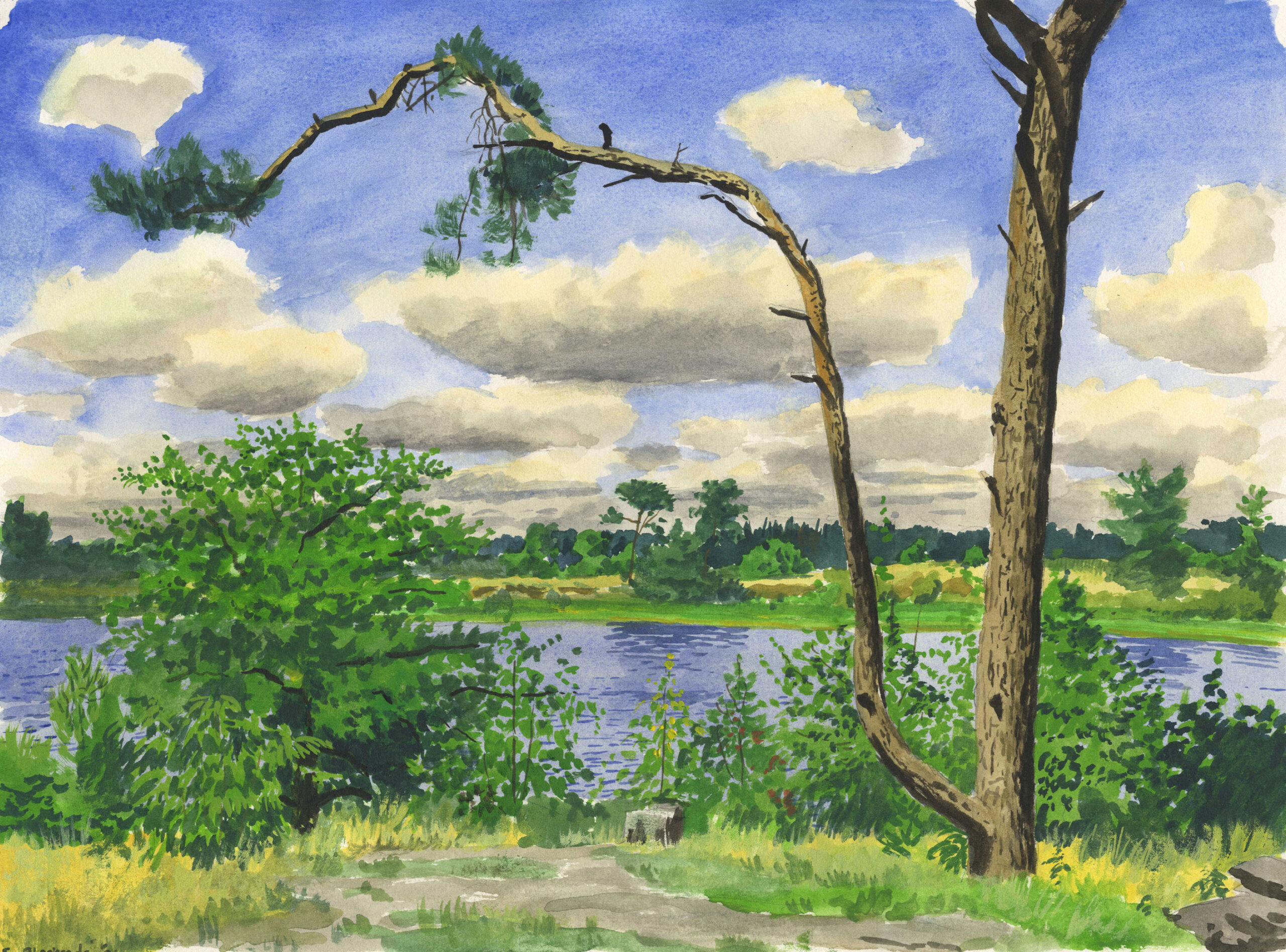 Uitzicht op de heide en de vennen van het natuurgebebied de Malpie net onder Valkenswaard in Brabant. Deze aquarel heb ik op een warme middag in augustus 2021 gemaakt.