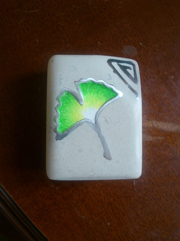 keniaase speksteen ingelegd met soldeer en wtte klei. Deze steen is gemaakt voor mijn buurvrouw , ze heeft een Ginko boom waar ze veel van houd,dus toen ik dit beeldje voor haar maakte dacht ik eraan om dat onderwerp erin aan te brengen. Ik vond het een mooi beeldje voor een prachtige vrouw.