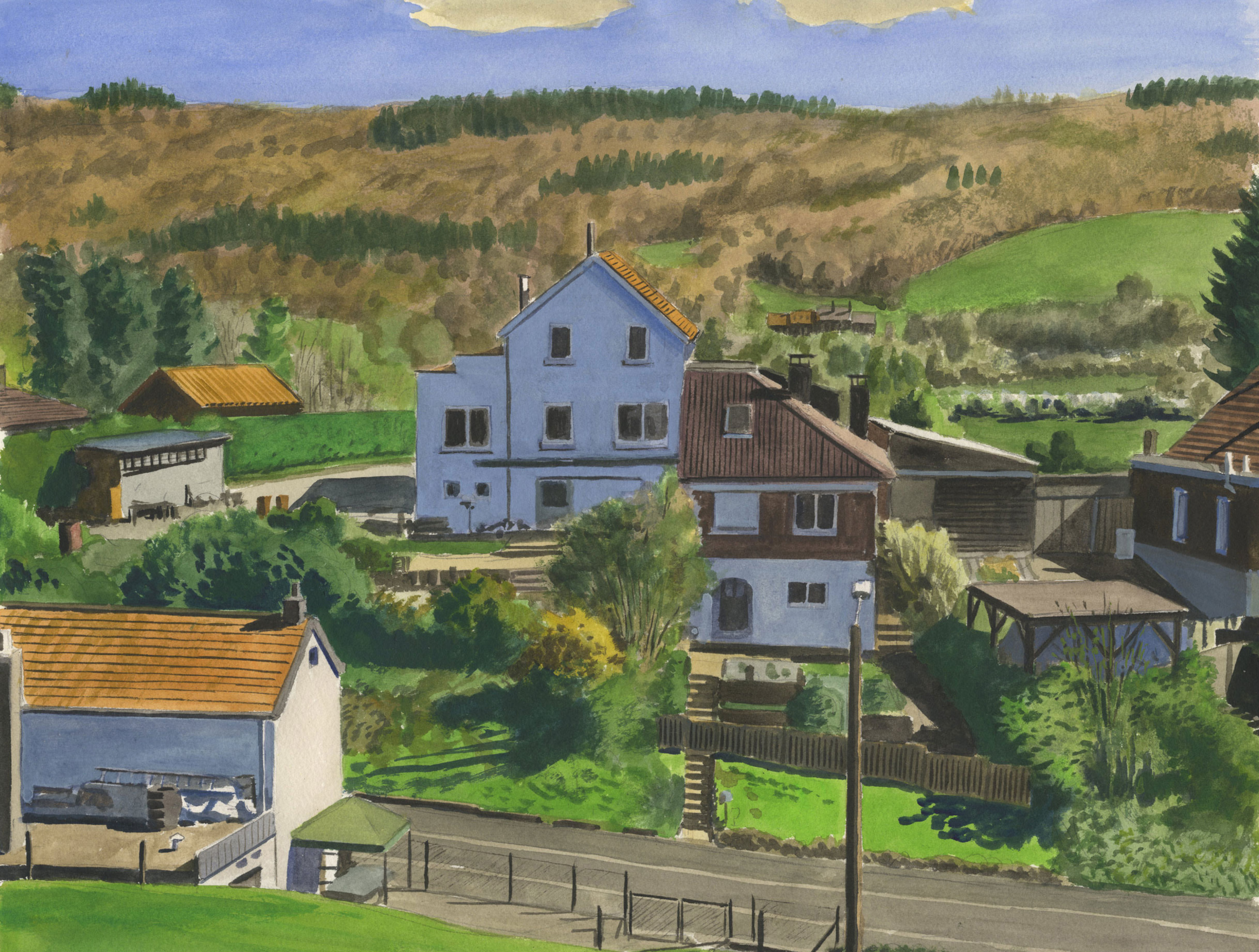 Een uitzicht vanuit de bossen bij Vaals op de huizen langs de weg van Wolfhaag in Nederland naar Gemmenich in Wallonië. Deze aquarel heb ik in april 2025 gemaakt.