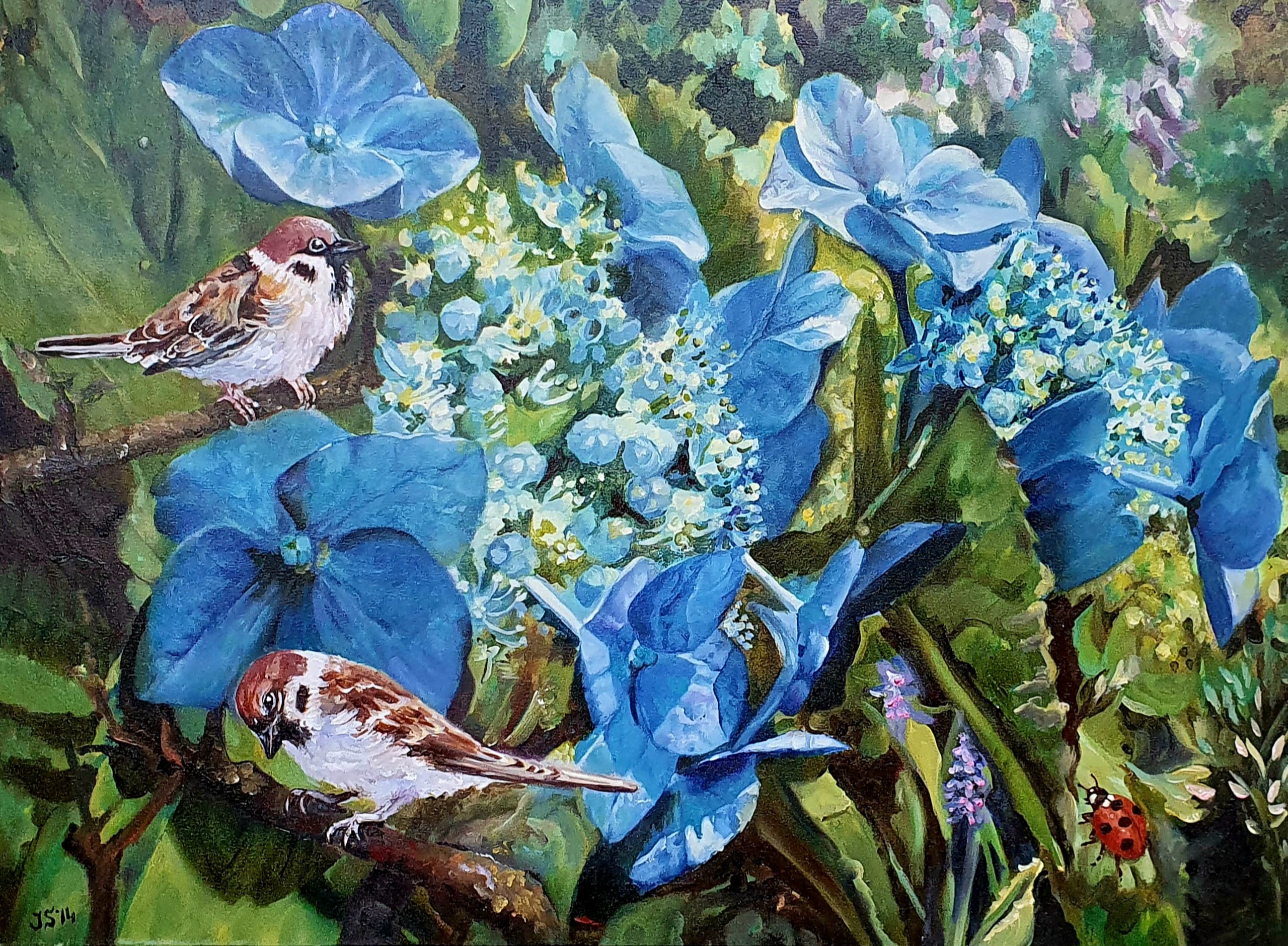 Het orgineel , alleen de hortensia's is nooit op de site terecht gekomen. Is van 2014... Altijd nog eens van plan geweest om er iets mee te doen.. Ik heb er nu wat mussen en een lieveheersbeestje aan toe gevoegd.