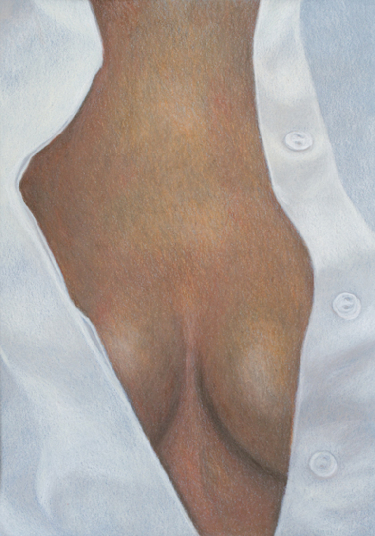 In deze tekening: het witte mannenoverhemd gedragen door een vrouw. Het is een klassieker in de modewereld en een sensuele look die veel mensen - man en vrouw - aanspreekt. Hier heb ik een close-up van een vrouwenlichaam in zo'n 'boyfriend shirt' getekend, op een manier dat het beeld bijna een grafische vorm wordt. Draai het beeld een slag naar rechts en het lijkt een collage van een landschap! Deze potloodtekening is gemaakt op denimblauw tekenpapier. Een kleur die voor dit werk een perfecte achtergrond vormt en schaduwen een mooie tint geeft. Van dichtbij zijn de potloodarceringen goed te zien, maar op afstand versmelten ze met elkaar en wordt het beeld realistischer. Originele werken kun je via de Qeimoy website vinden. De meeste werken kun je ook als print bestellen op een materiaal en in een afmeting naar keuze.