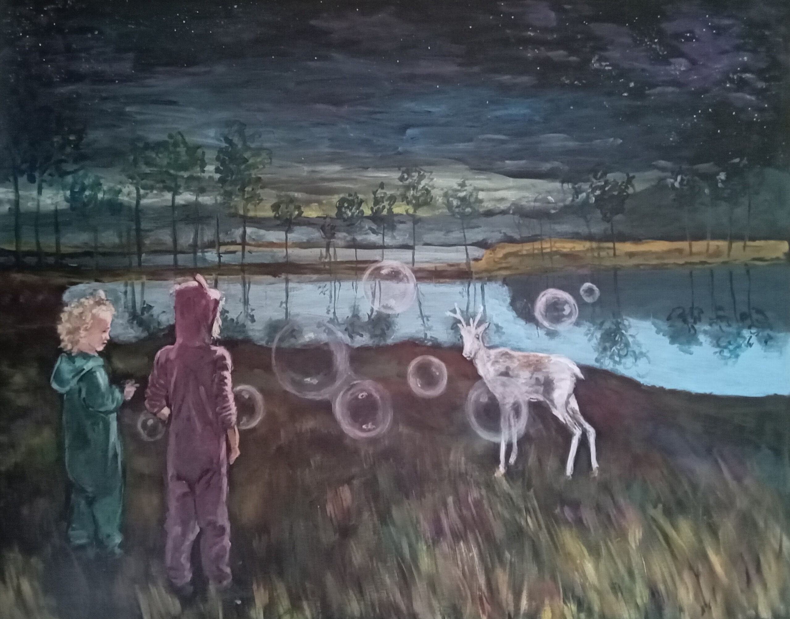 Ontmoeting tussen een ree en bellen blazende meisjes in een sferisch landschap.