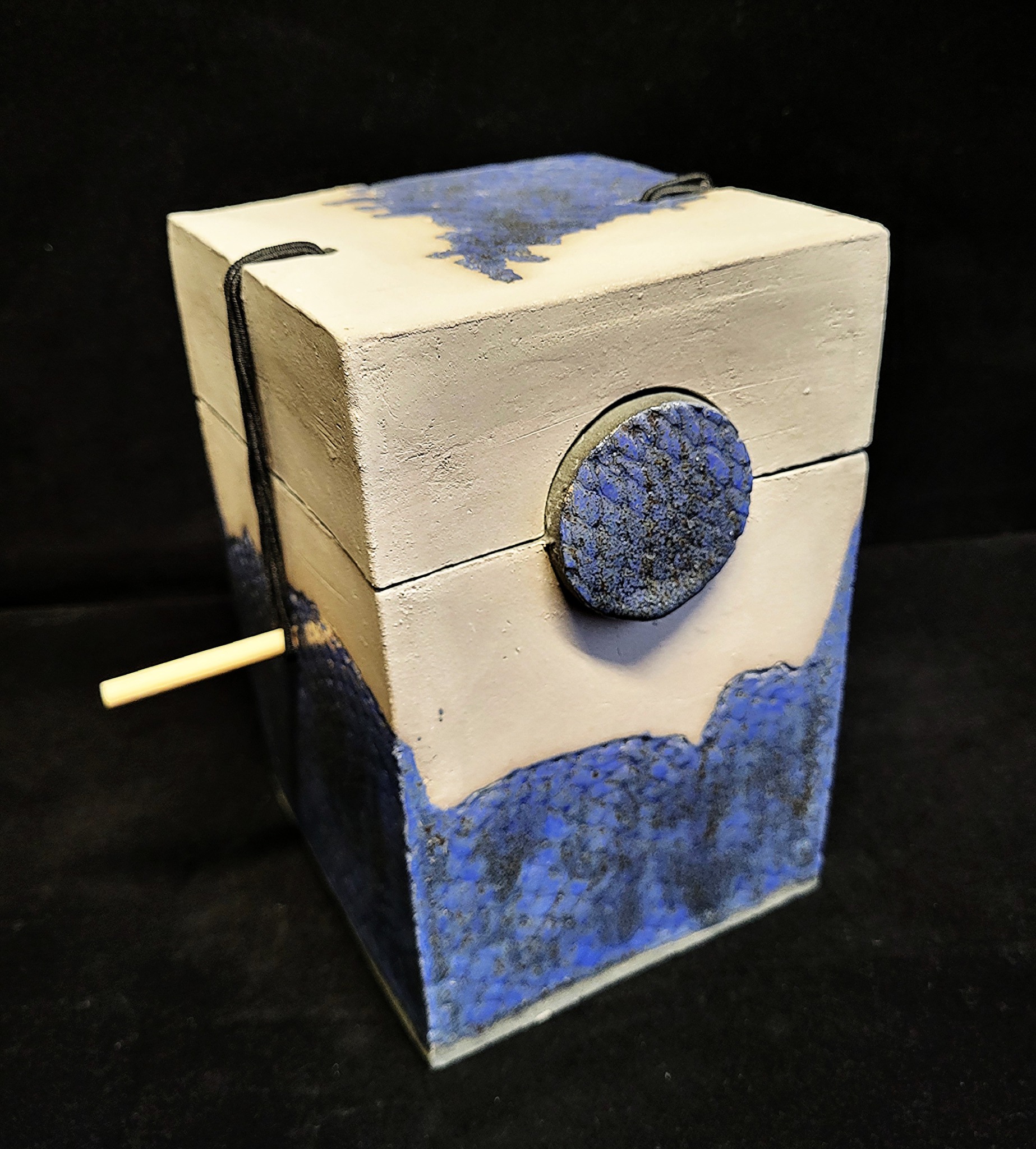 Dit doosje is gemaakt van fijne chamotte klei en bewerkt met een gekleurd glazuur op de plekken met textuur. Het bestaat uit meer dan één deel, waar telkens iets waardevols in bewaard kan worden.