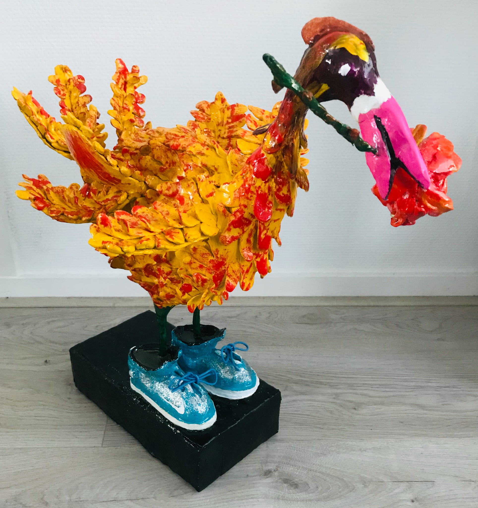 Pim van Pelt maakt vrolijke, kleurrijke en betaalbare kunst. Mensen een glimlach ontlokken is het doel. Het materiaal: keramiplast, acryl en afgewerkt met meerdere lagen epoxie.